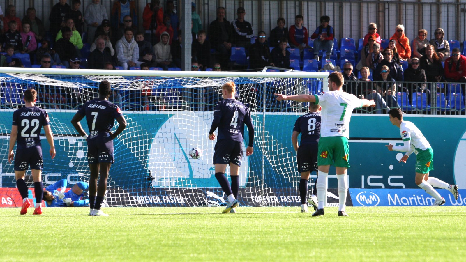 Moses Mawa er nærmest i andre omgang da han kommer alene med keeper. Dessverre for hurtigtoget er den sist touchen på ballen litt for lang og avslutningen triller like til side for stolpen.