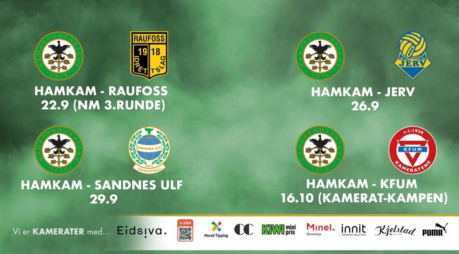 Legg også merke til at den store Kameratkampen spilles hjemme mot KFUM-Kameratene lørdag 16.10.2021 kl. 15.00.