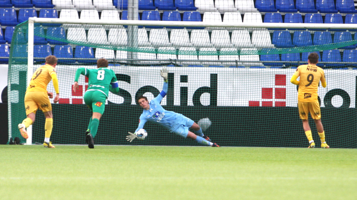 etter halvtimen spilt dømmes det straffespark til gjestene fra nord. Mats Pedersen stilte seg opp på elleve meter og skulle overliste Kasper Nordhagen i Kamma-buret. Der er sistnevnte raske nede og redder skuddet. Returen blir klarert.