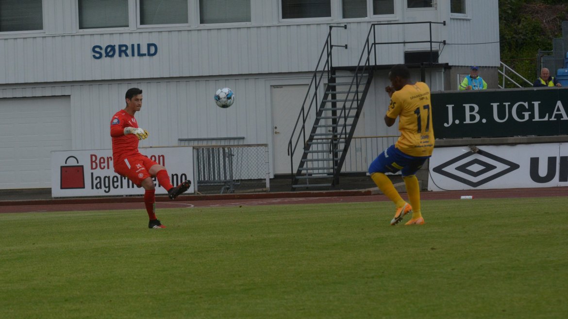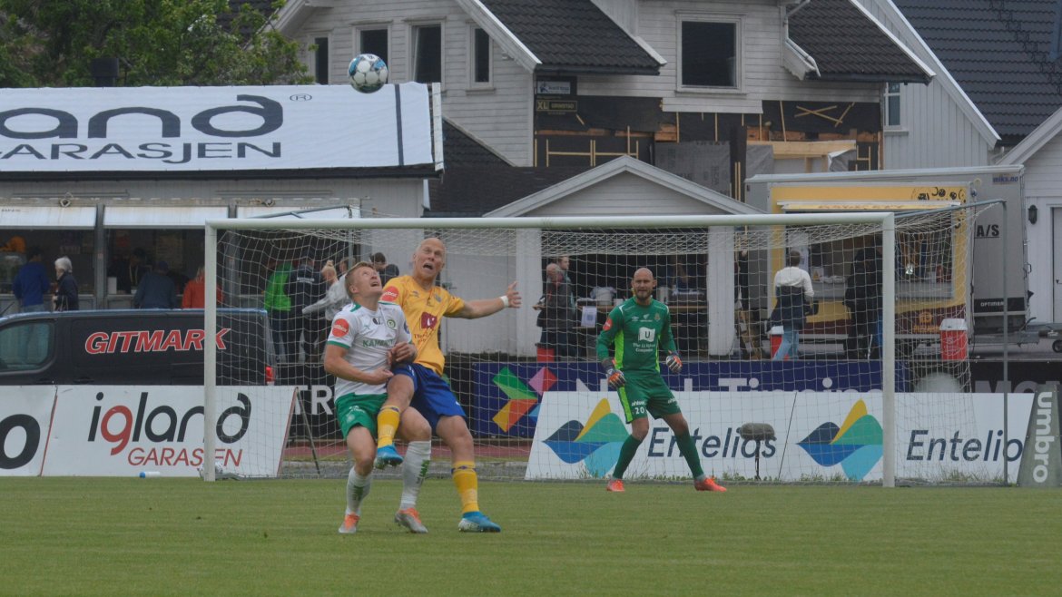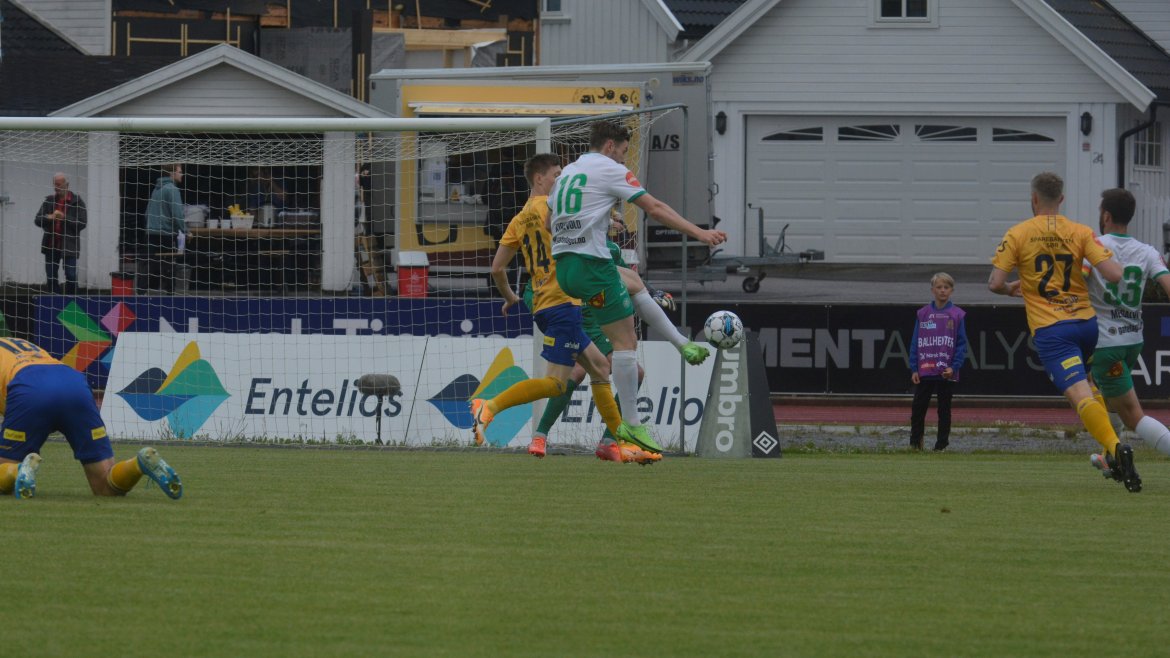 Pål Alexander Kirkevold får slått et strålende innlegg fra venstresiden. På bakerste kommer brumunddølen og smeller ballen i nettet på helvolley. Utagbart for bergenseren i Jerv-buret.