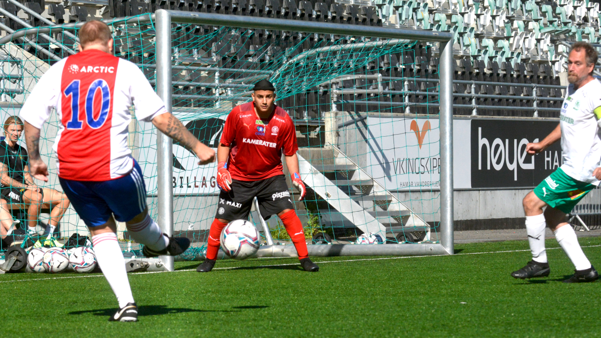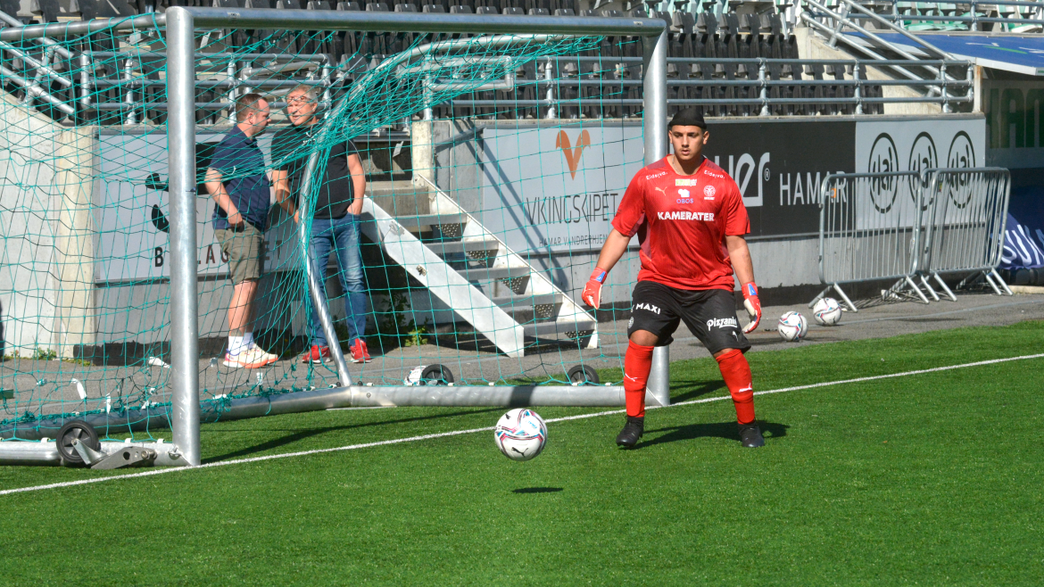 Fra sin midtbaneposisjon hamret Aleks først inn en retur og sendte Kamma opp i 2-1, før han like etter bøyde ballen opp i motsatt kryss til 3-2. Og for virkelig å vise at han bokstavelig ofrer alt for klubben i Hamar, satte han uredd fram hodet i en hodeduell med 18-årsgrense.