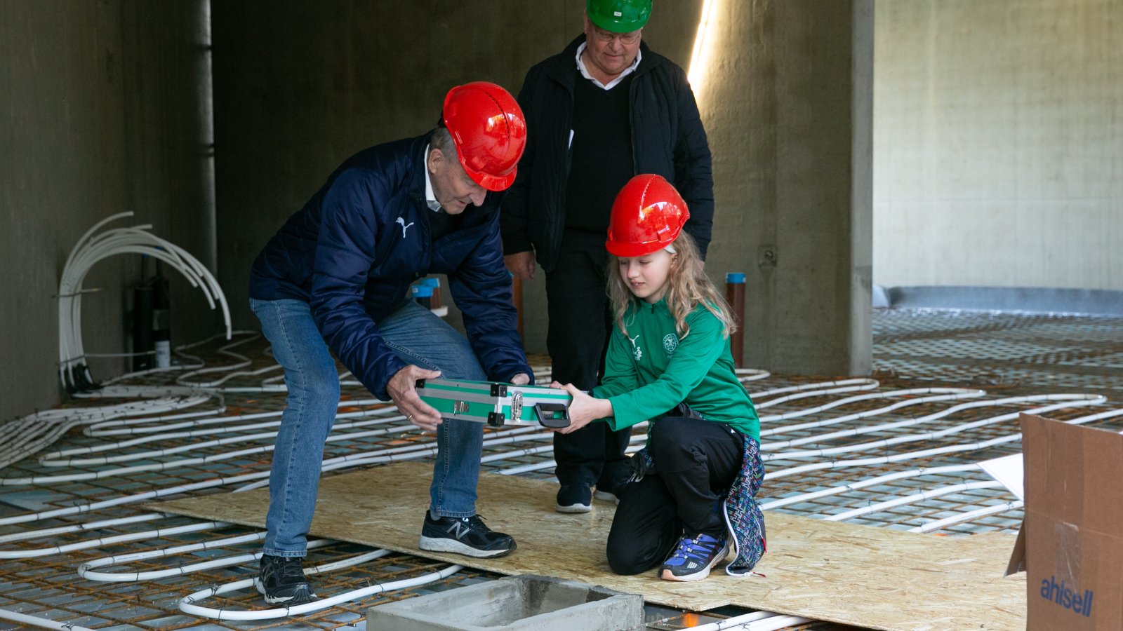 Her legger Finn Thorsen (80) og Emilie Heide Bredesen (11) ned boksen forteller om historien i forkant av byggingen. Bak skimter vi en stolt leder av hovedlaget, Per Gustavsen som bivåner det hele:
