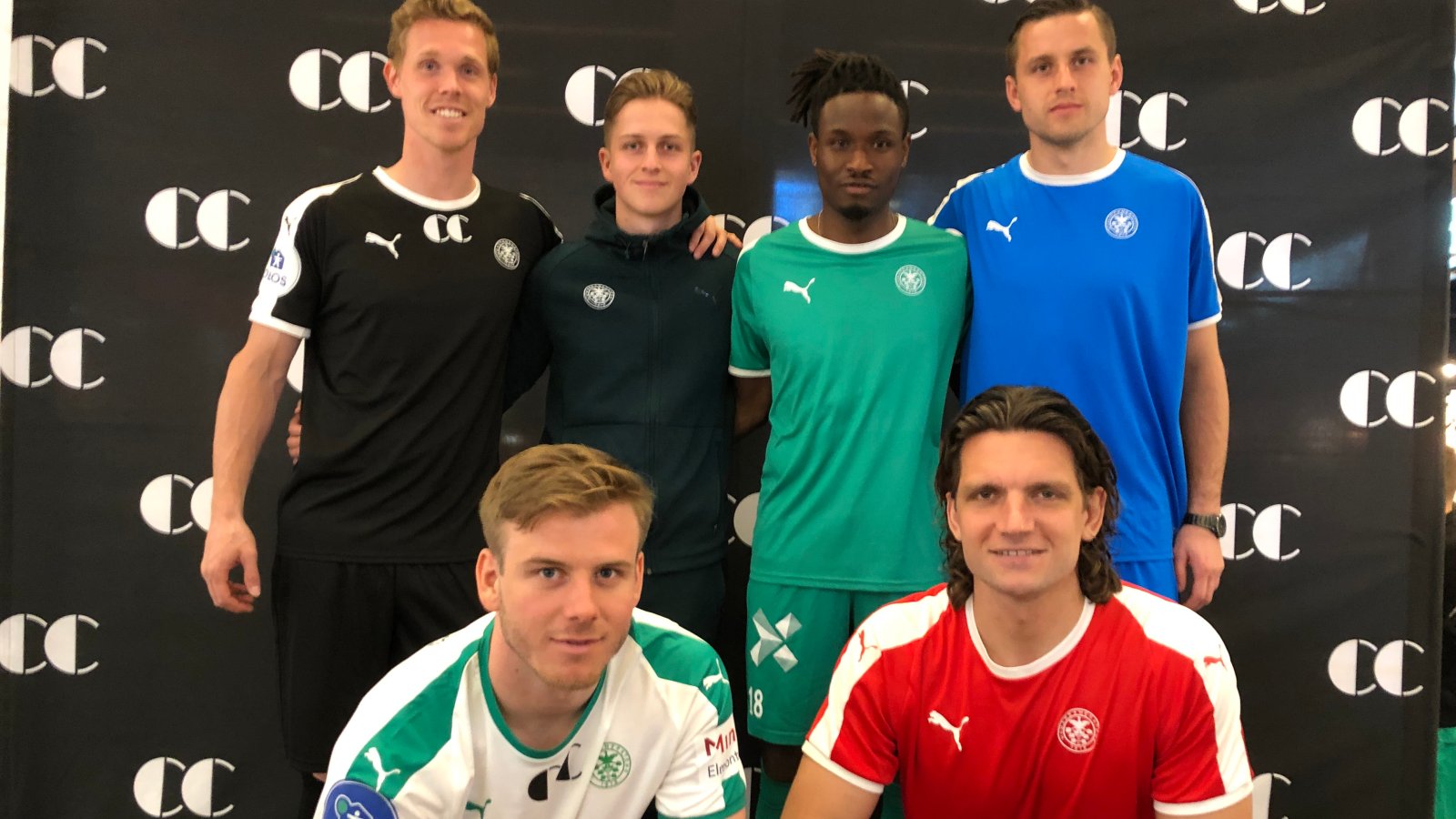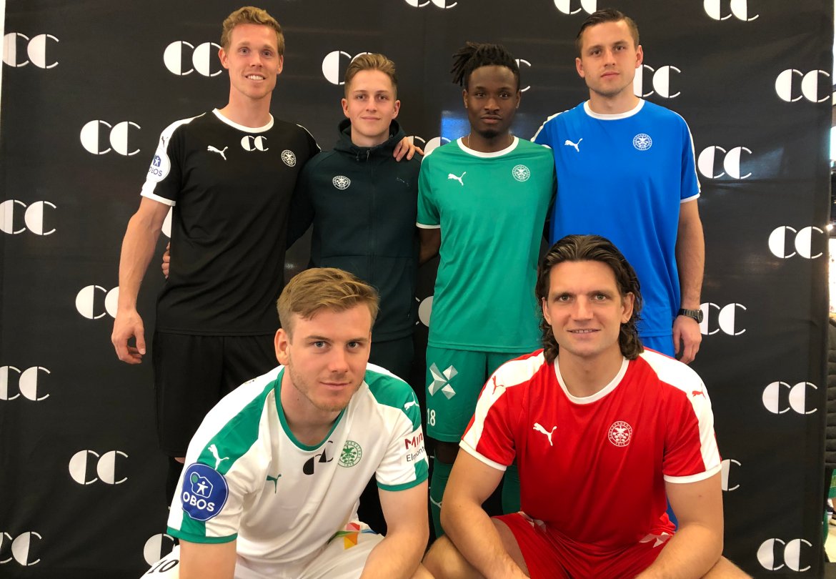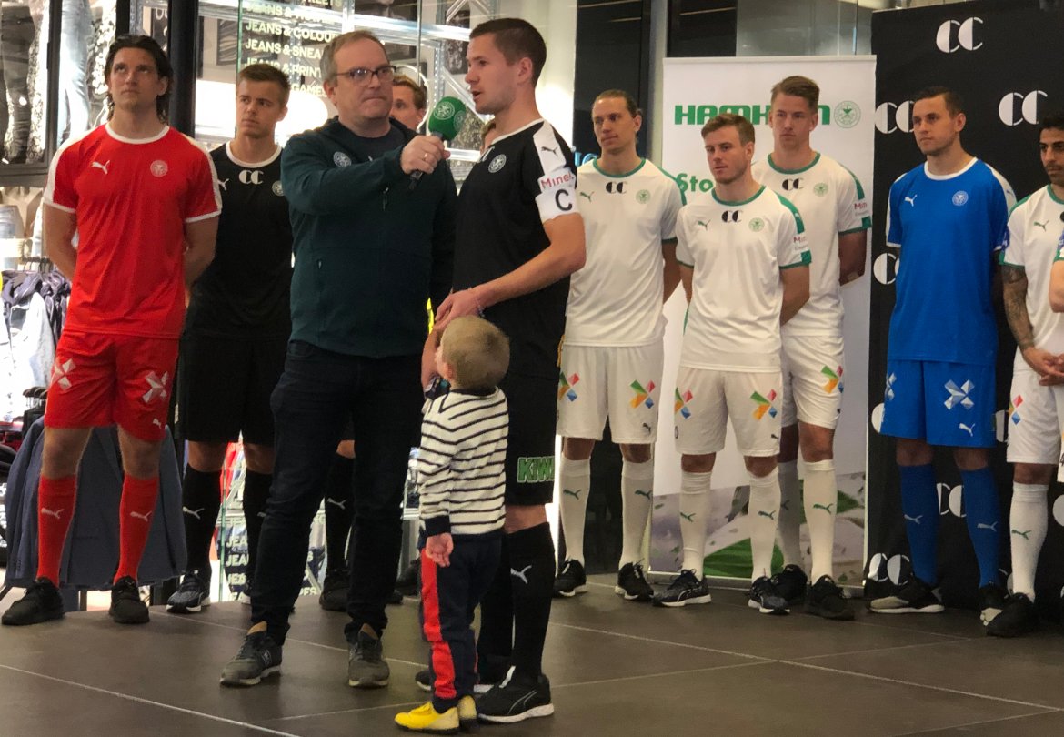 På bildet ser dere hvordan HamKam blir seende ut i sesongen 2019. Bak fra venstre ser vi Jacob Egeris vise frem årets tredjedrakt, Simen Bolkan Nordli med årets reiseantrekk, Jean Alassane Mendy viser årets bortedrakt, mens Lukasz Jarosinski viser en av årets tre keeperfarger. Foran på huk ser du Emil Sildnes med årets hjemmedrakt og Marco Priis Jørgensen med rød keeperdrakt. Årets tredje keeperdrakt blir sort.