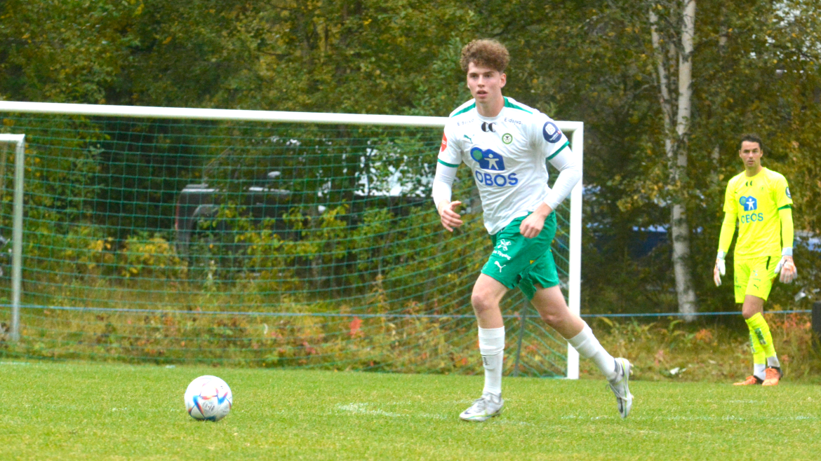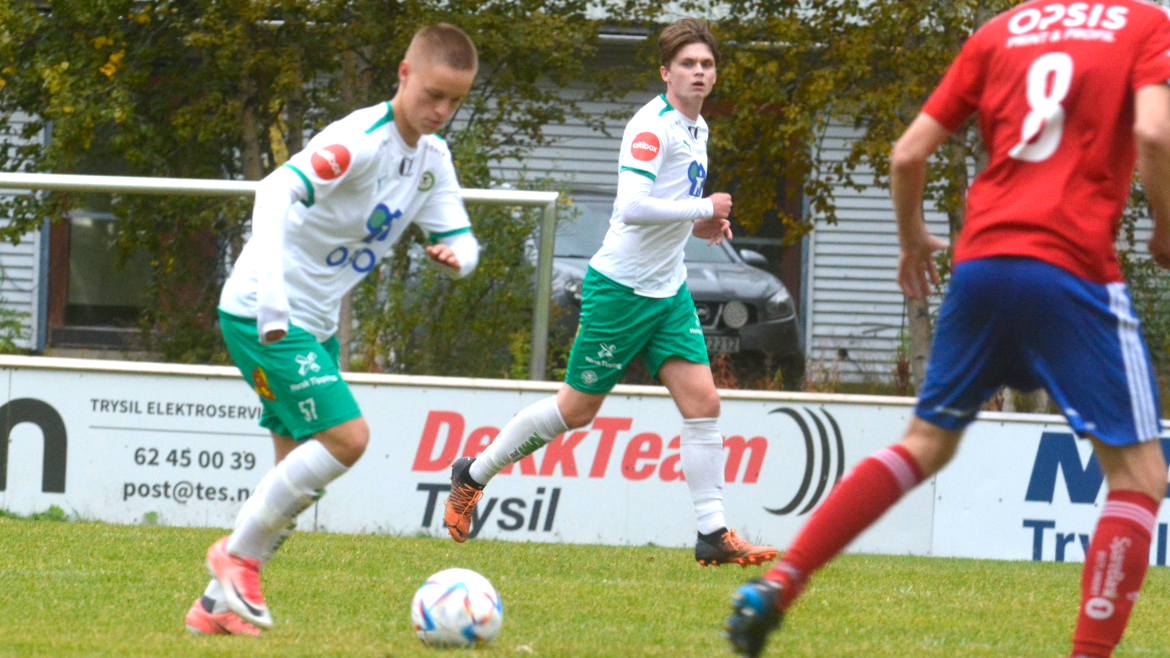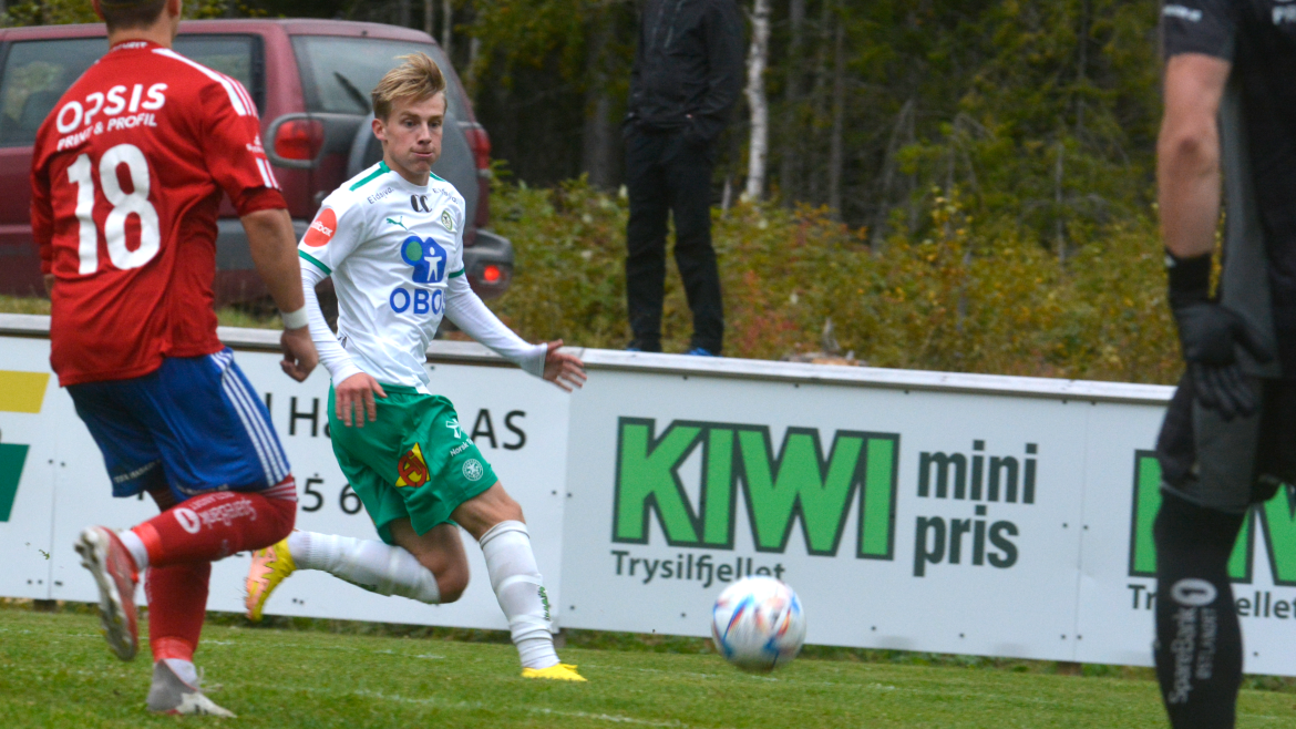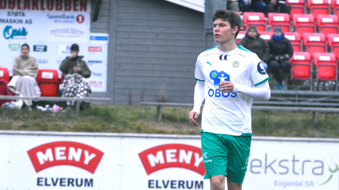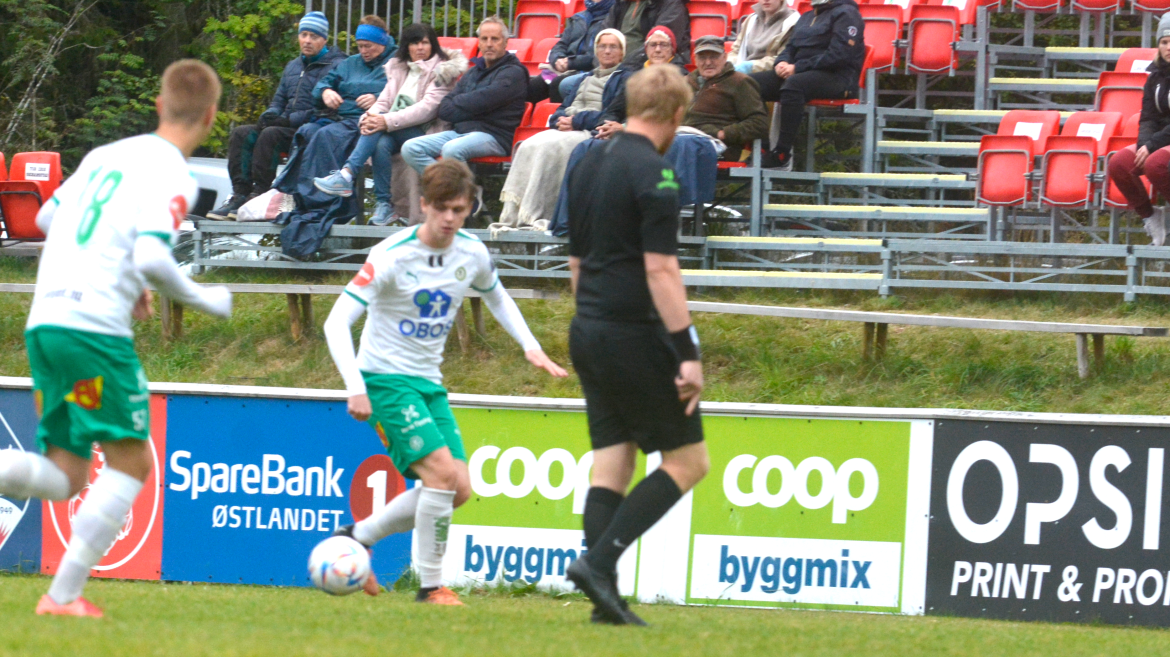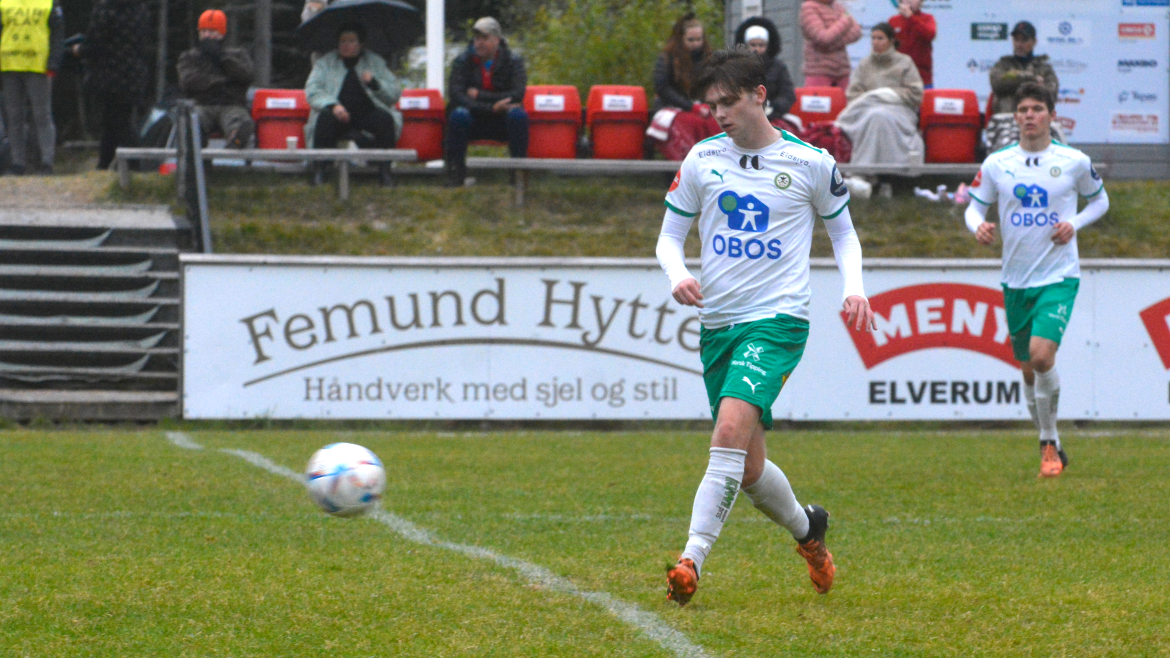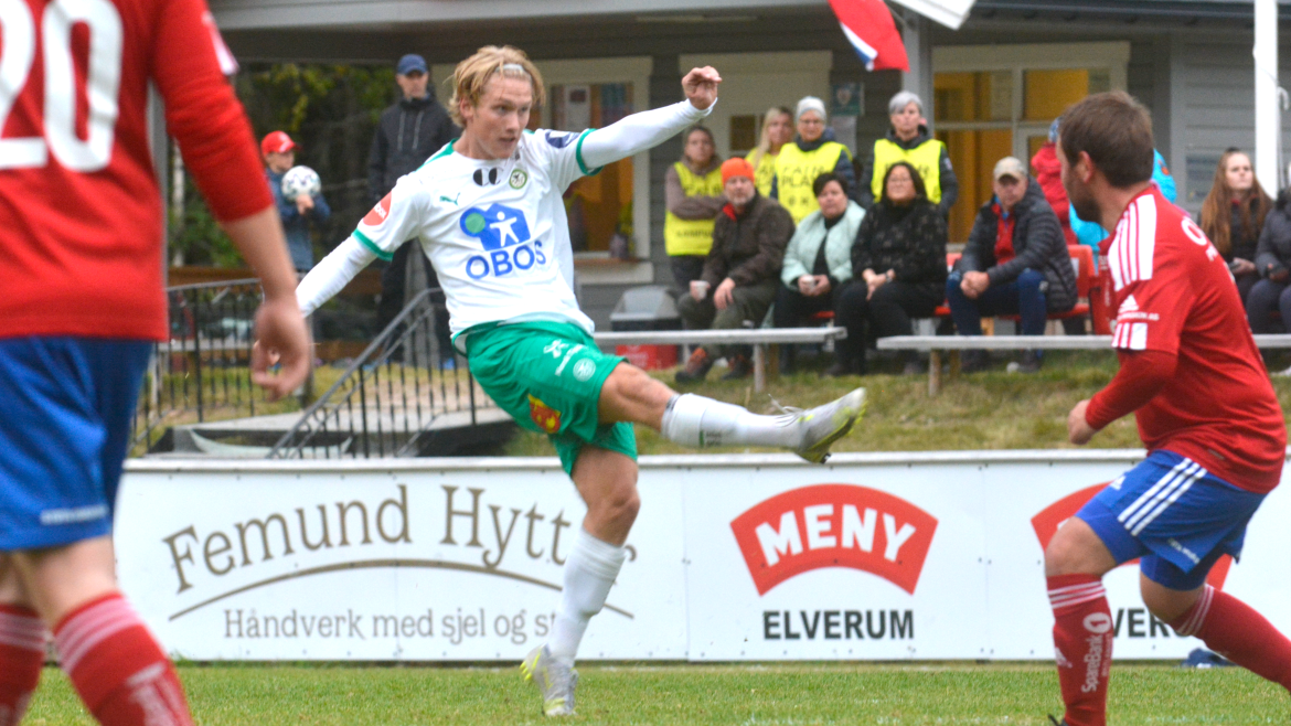 Hamar-gutten gikk for skudd. Ballen finner veien til nærmeste kryss. Og da snakker vi oppe i vinkelen. Ballen treffer både tverrliggeren og stanga samtidig før det blir nettsus, til stor glede for de hvite og grønne.