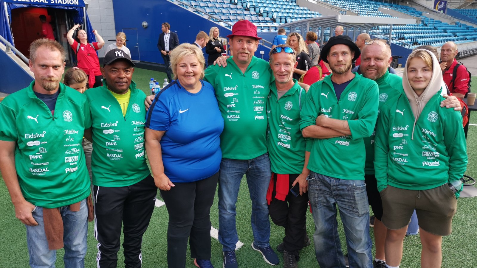Det ble en stor dag for landets statsminister på Ullevaal stadion i går. Ikke bare fikk hun og Regjeringen spille kamp mot regjerende cupmester, Fredrikstad, men etter kampslutt fikk hun treffe gatelaget til Kamma. Ikke rart Erna smilte bredt... Gatelaget
