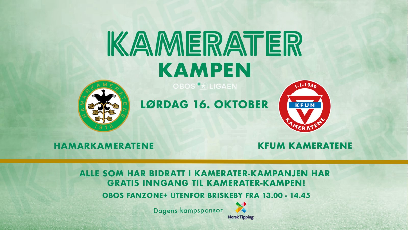 Lørdag 16. oktober kl. 15.00 spiller HamKam hjemmekamp mot KFUM-Kameratene. Det blir årets Kamerater-kamp med gratis inngang for de som er med som Kamerater: Herrelaget