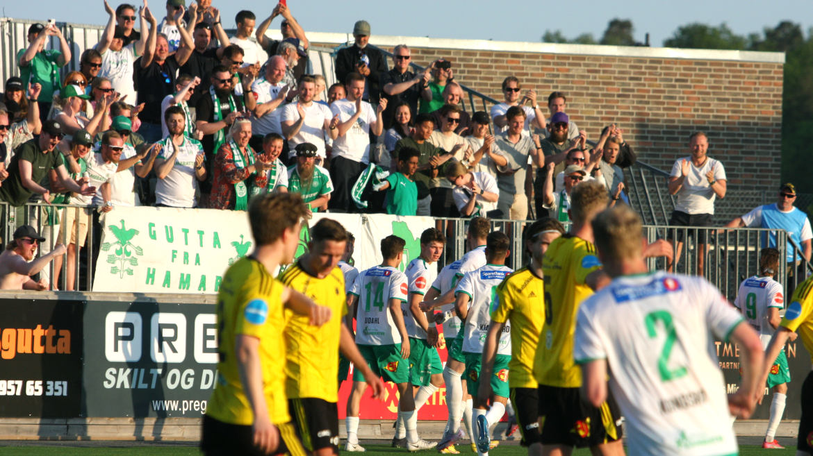 Dansken scorer dermed sitt første Kamma-mål til stor jubel for de tilreisende Hamarsingene.