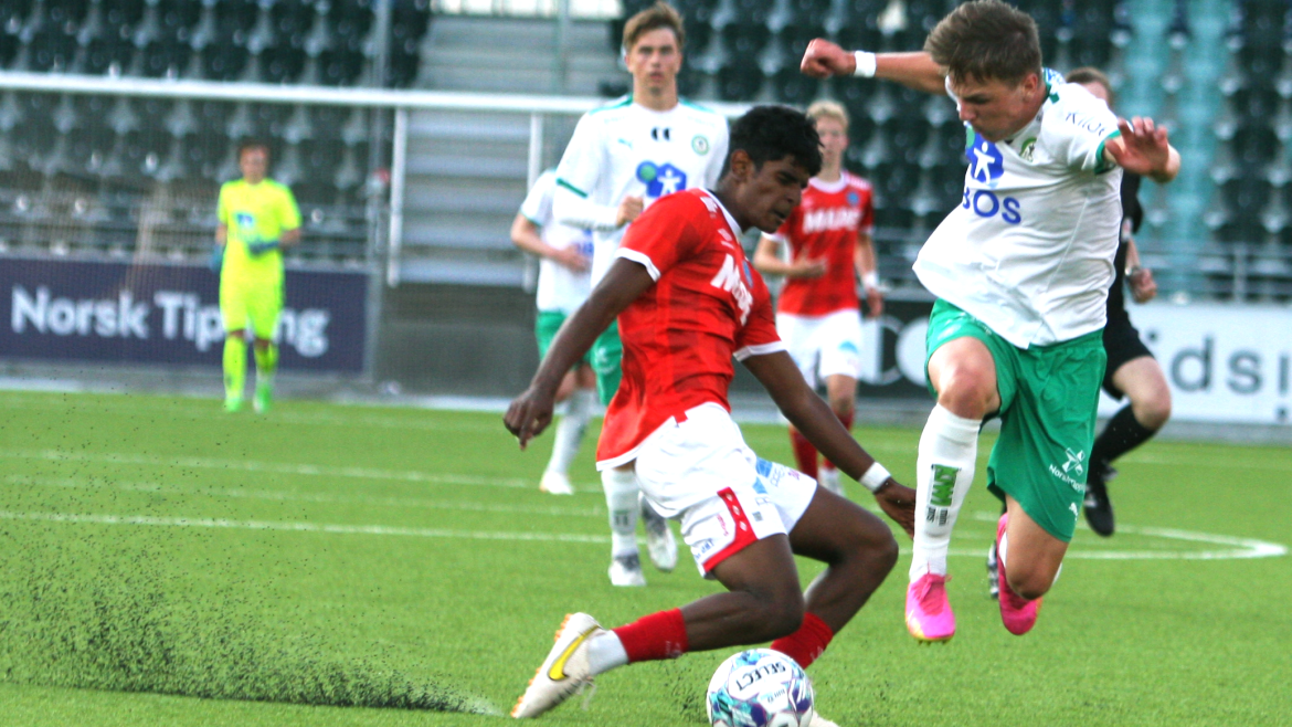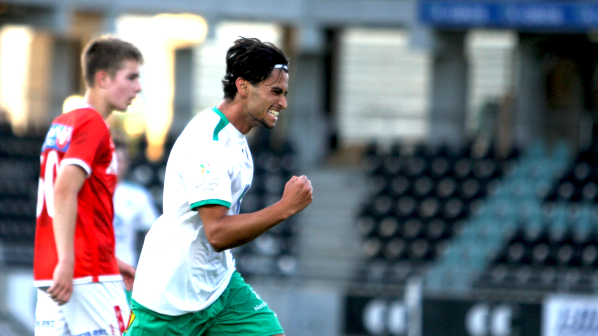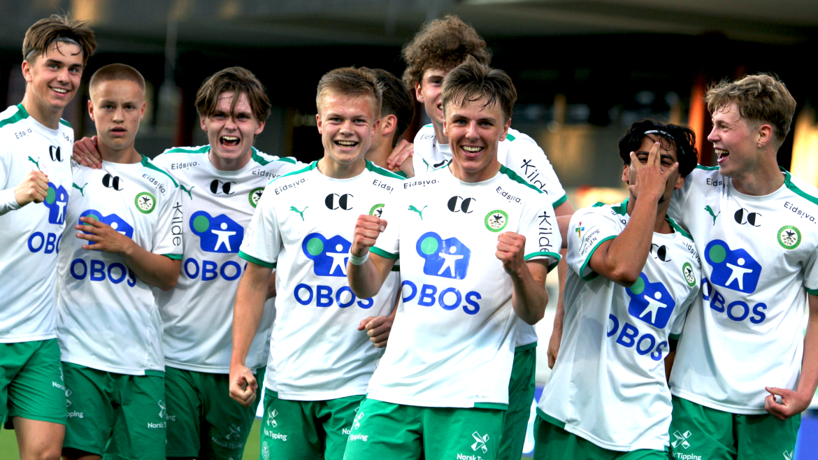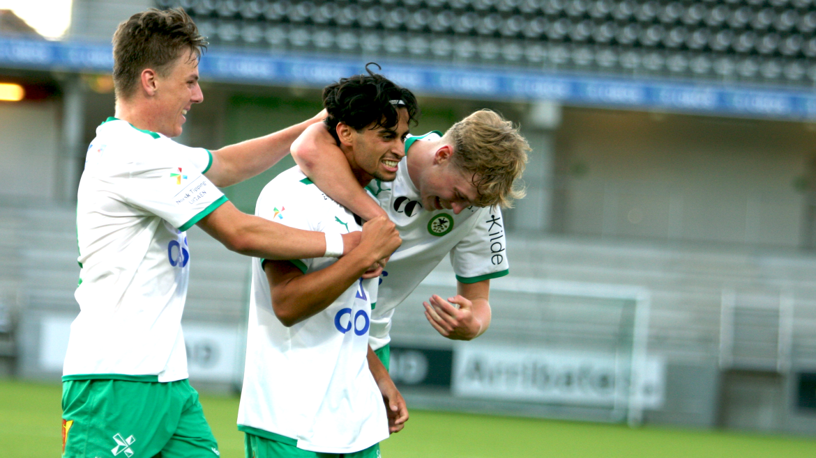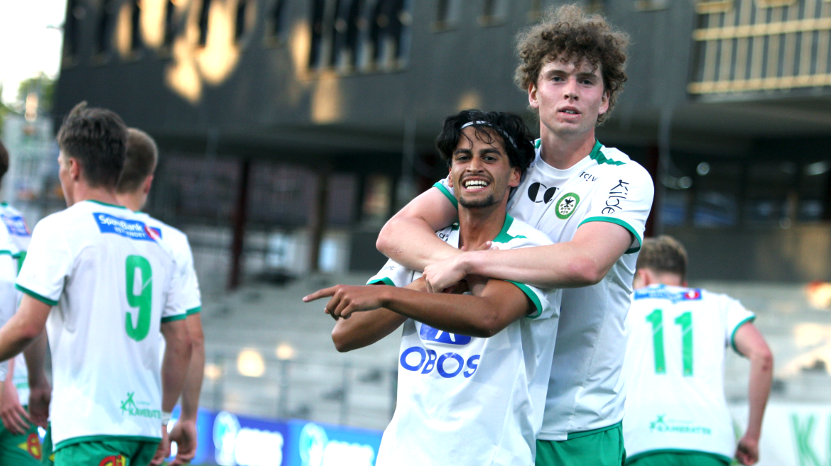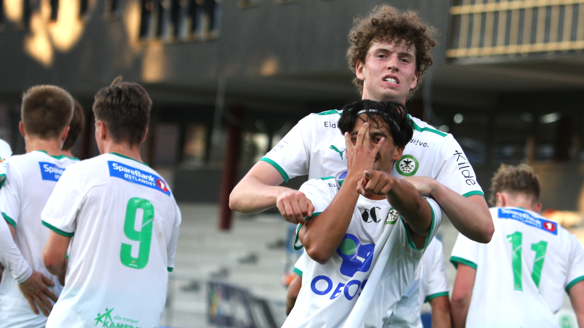 Hjemmelaget spiller seg inn i sekstenmeteren, der vender Farzam Dadras av to motspillere både en og to ganger før han triller ballen inn i nærmeste hjørnet med venstrefoten, til stor jubel (bildet) for unggutta fra Hamar.