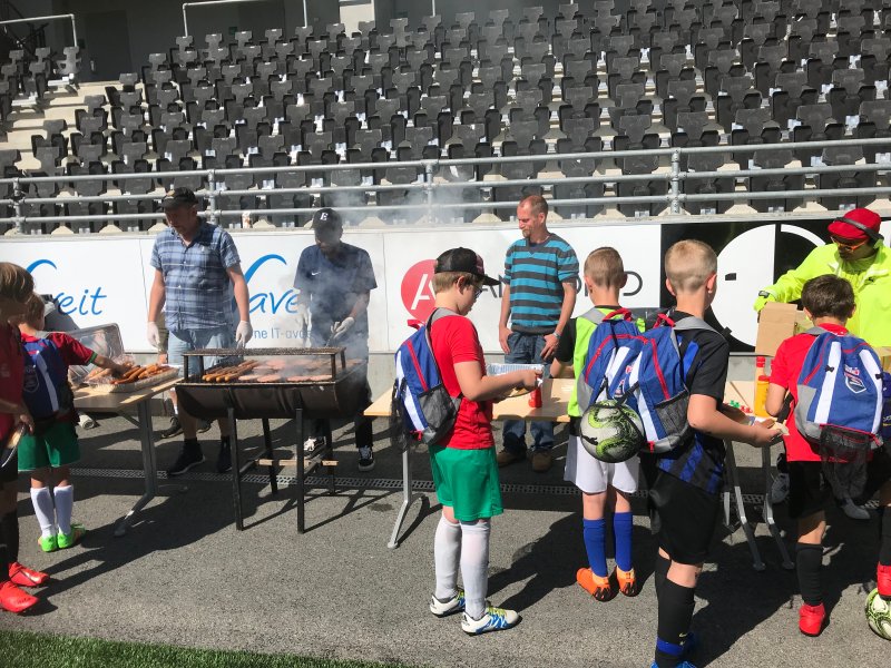 Også under årets Fotballskole stod gatelaget bak grillene på avslutningsdagen. Og gutta på laget smilte og jobbet seg svette. Gatelaget