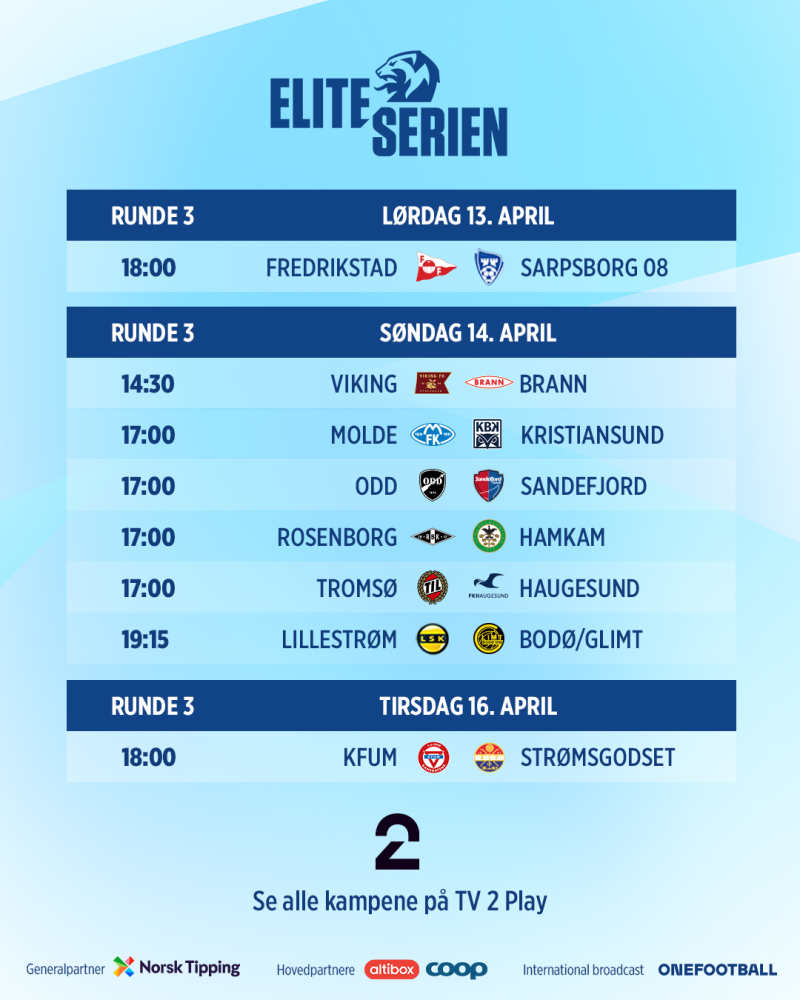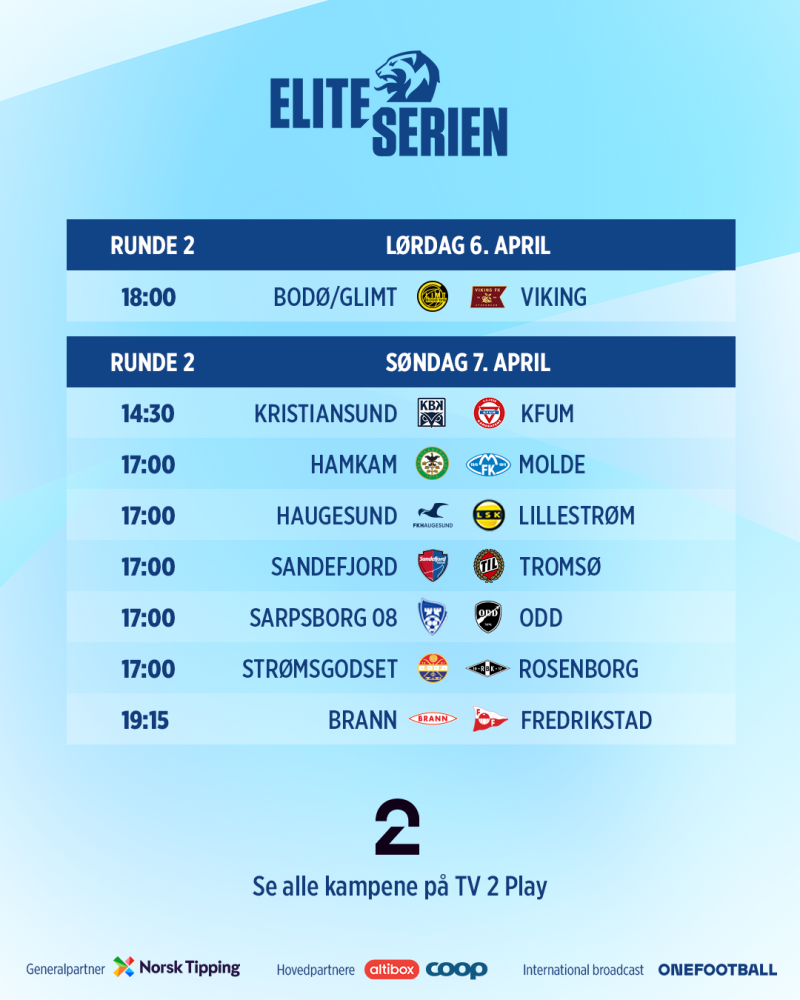 | Bodø/Glimt | - | Molde | 21.apr | 19.15 |