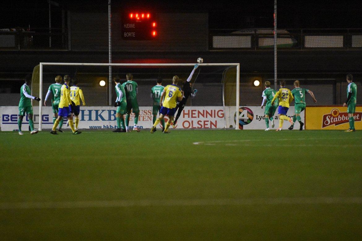 HamKam-rekruttene fikk en god start på oppgjøret da Odmar Færø setter inn en tidlig ledelse etter en Vaagan Moen-corner. Odmar er våken og fanger nedfallsfrukten og er kontant i det han smeller ballen i mål liggende.