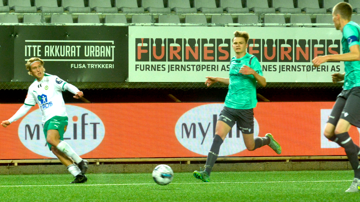 Nybergsund-keeperen brukte litt for lang tid med ballen innenfor seksten da Benjamin Thoresen Faraas presset han. Ballen gikk via en pressende Flisa-unggutt til Jonas Rasen som fikk en enkel jobb med å trille ballen over streken fra sju meter. Kveldens første for Hamar-gutten.