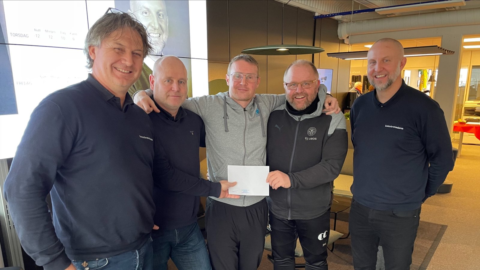 De ansatte hos Kontorleverandøren sa nei til til egen julegave og ville heller bruke pengene på Gatelaget i HamKam. Torsdag fikk spillere og trenere overrakt gaven av daglig leder Terje Bessesen (til venstre) og salgskonsulent Anders Kolbuholen (til høyre) under en julelunsj hos Kammas lojale samarbeidspartner. Gatelaget