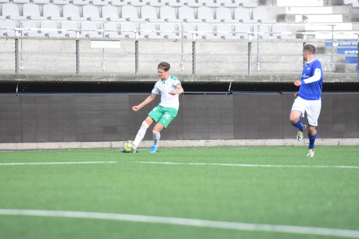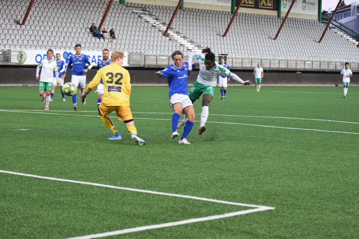 Kort tid etter er det Kvernstuen selv sin tur. Etter et veggspill med Jørgen Holmlund er han alene med keeper. Fra skrått hold (bildet) setter han den forbi sisteskansen og øker til 2-0. Ti minutter senere forlater han banen med en skade i albuen. Hør hva han sier om skaden i videointervjuet lenger ned i saken.