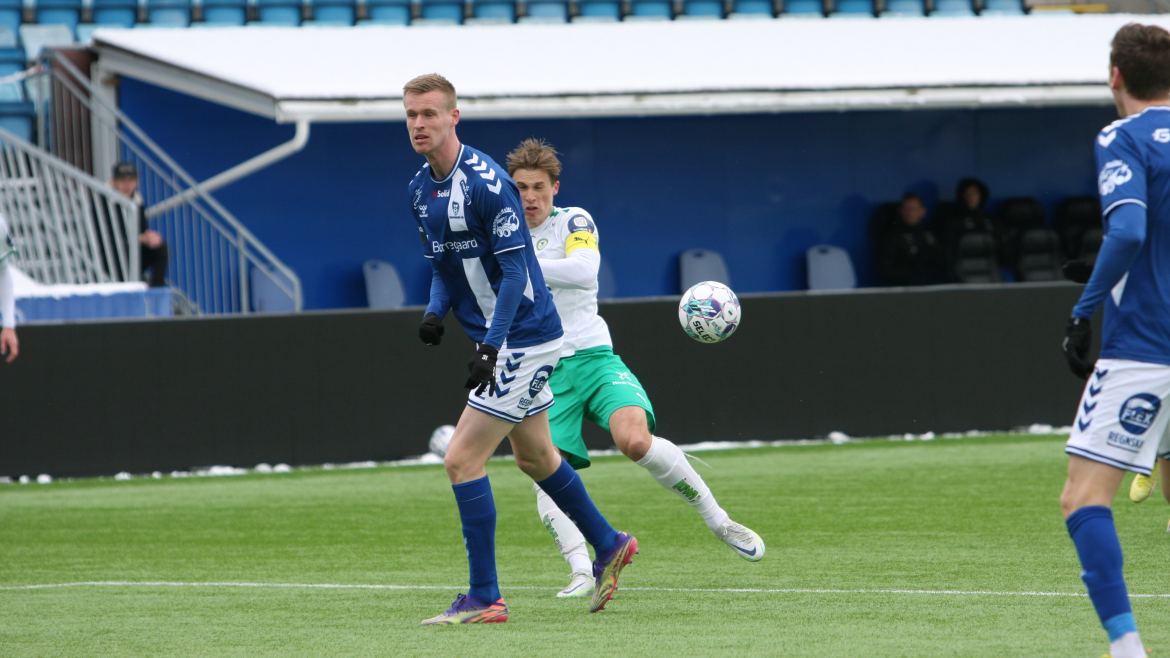 Åtte minutter senere får endelig bortelaget hull på byllen. Etter godt spill mottar Oliver Kjærgaard ballen fra Pål Alexander Kirkevold. Den danske indreløperen forserer et par meter før han kliner ballen nede ved stolperota i nærmeste hjørnet fra 22 meter.
