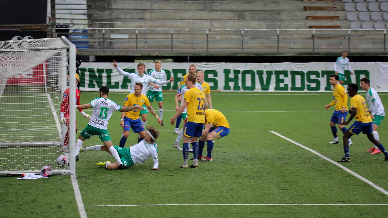 Tjue minutter før slutt slåes en dødball inn fra korridor hvor Jonas Enkerud sklir ballen over streken. Begge lag har sjanser til å gå seirende ut av oppgjøret uten hell og deler dermed poengene etter 2-2.