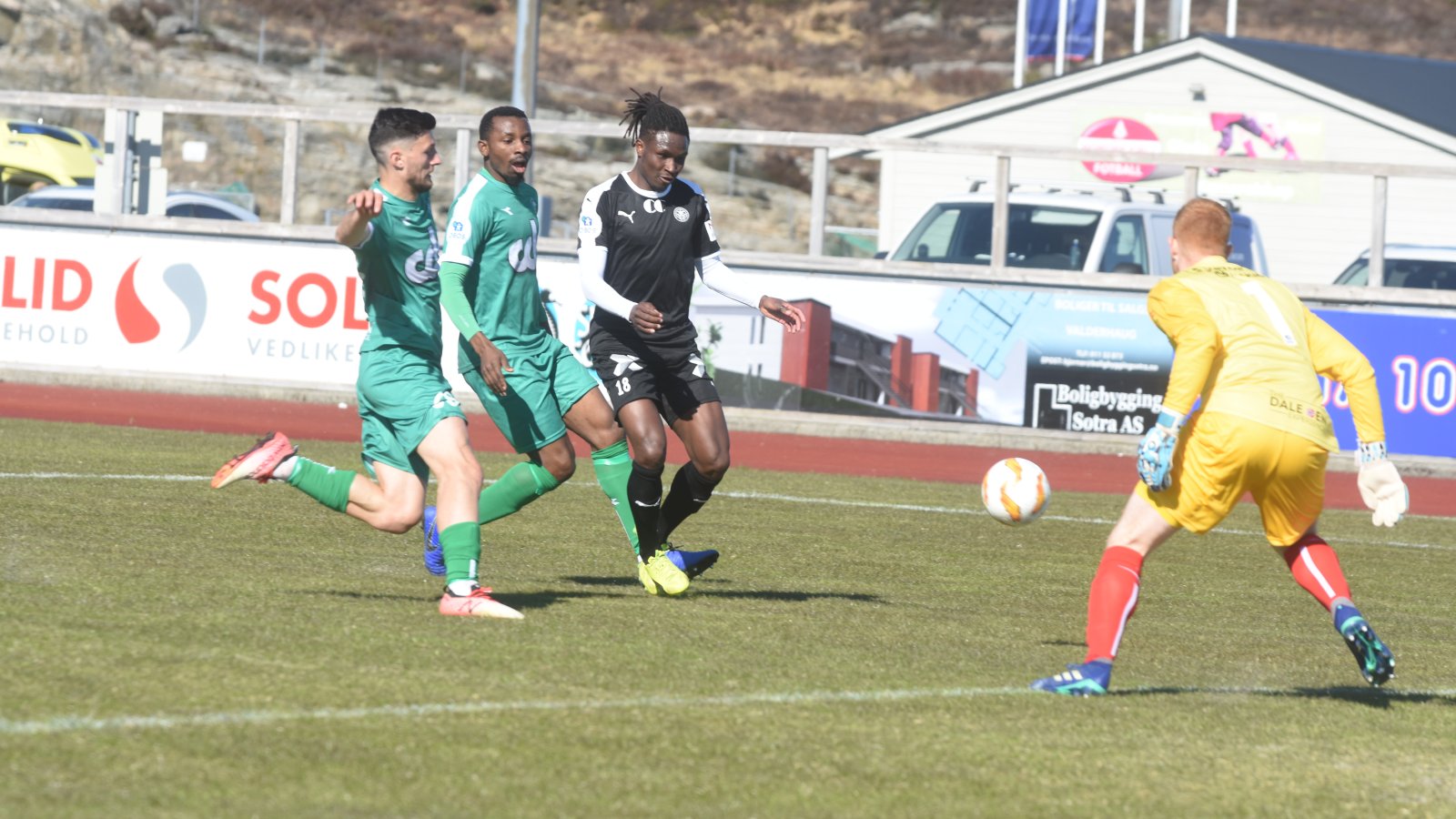 På overtid i første omgang åpnet hjemmelaget scoringsballet. En corner ble slått inn på bakerste, der sto Jo Sondre Aas, som fikk heade ballen tilbake i feltet. Der dukket Sørensen opp og headet Nest-Sotra i føringen. Det var det siste som skjedde i den første omgangen.