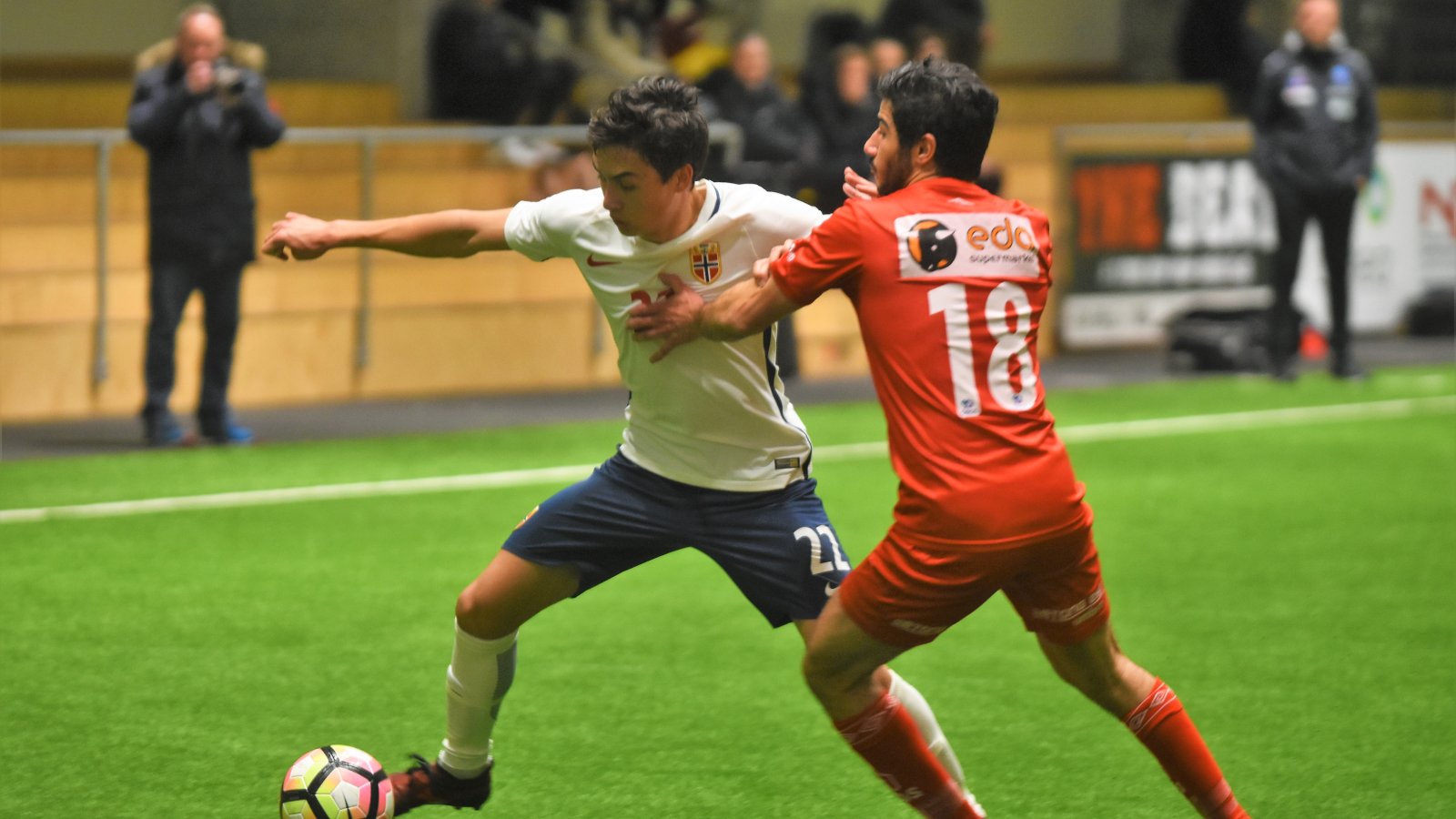 Det var Norge som tok ledelsen først. Erling Braut Håland som til daglig spiller i Molde setter først inn kampens første straffespark før han øker ledelsen til 2-0 til bortelaget rett før pausesignalet.