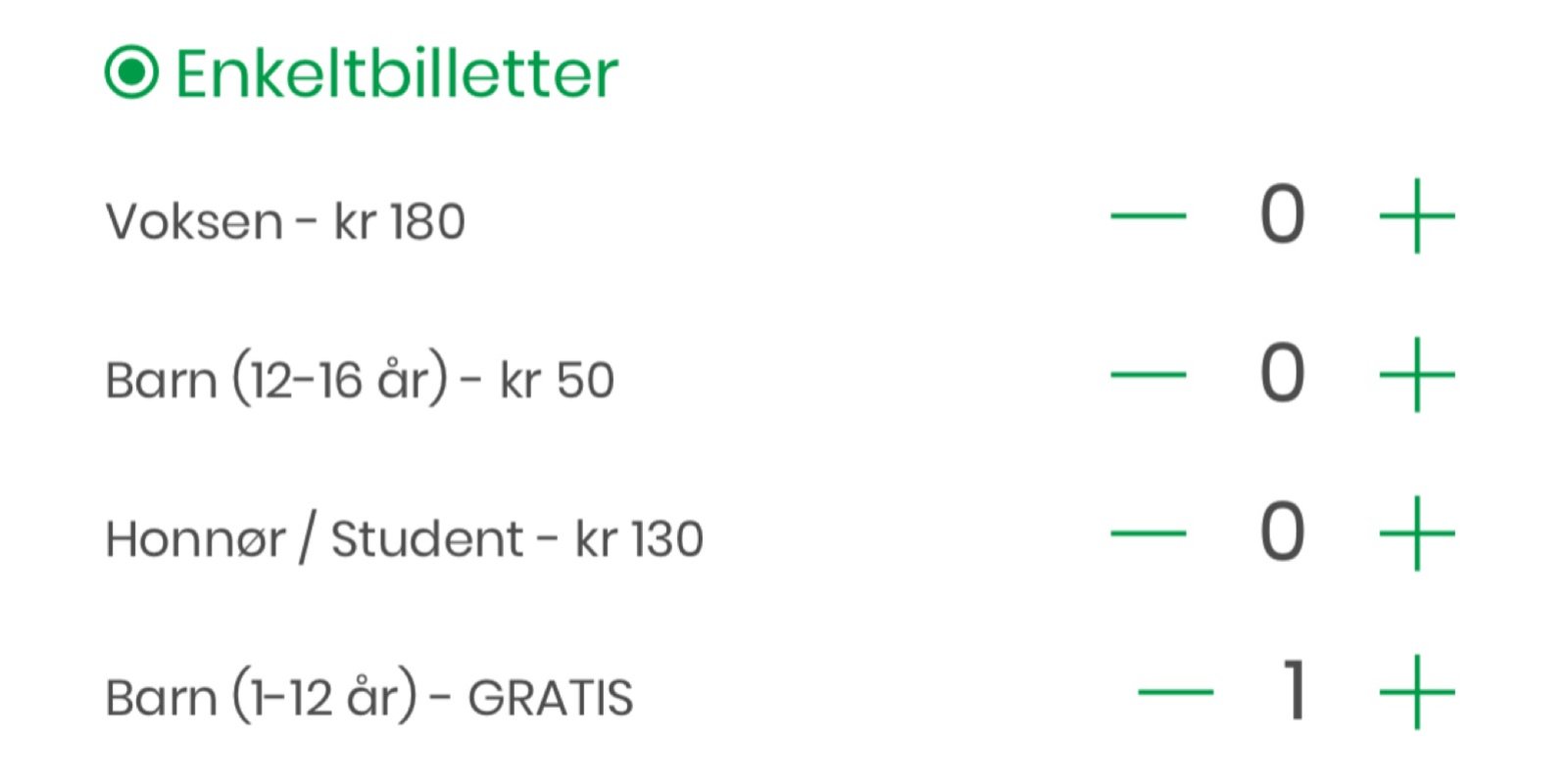 Nå får man også enkelt skaffet billett til barn under 12 år på appen ved å benytte den nye funksjonen som du kan se på bildet - "barn (1-12 år) - GRATIS".
