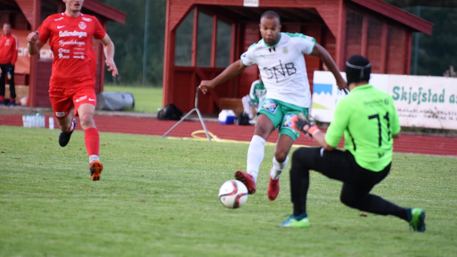 Det var mange sjanser til begge lag i andre omgang. Med kvarteret igjen av kampen spiller Mads Miguel Nylende en flott stikker gjennom til Johnny Buduson som er sikker som banken alene med keeper. (bildet).