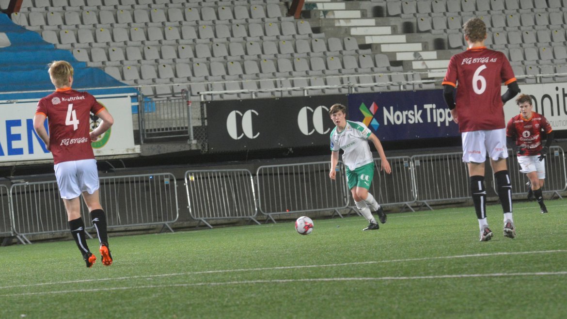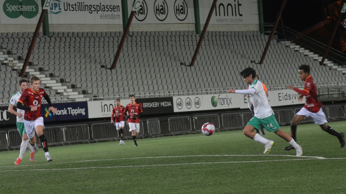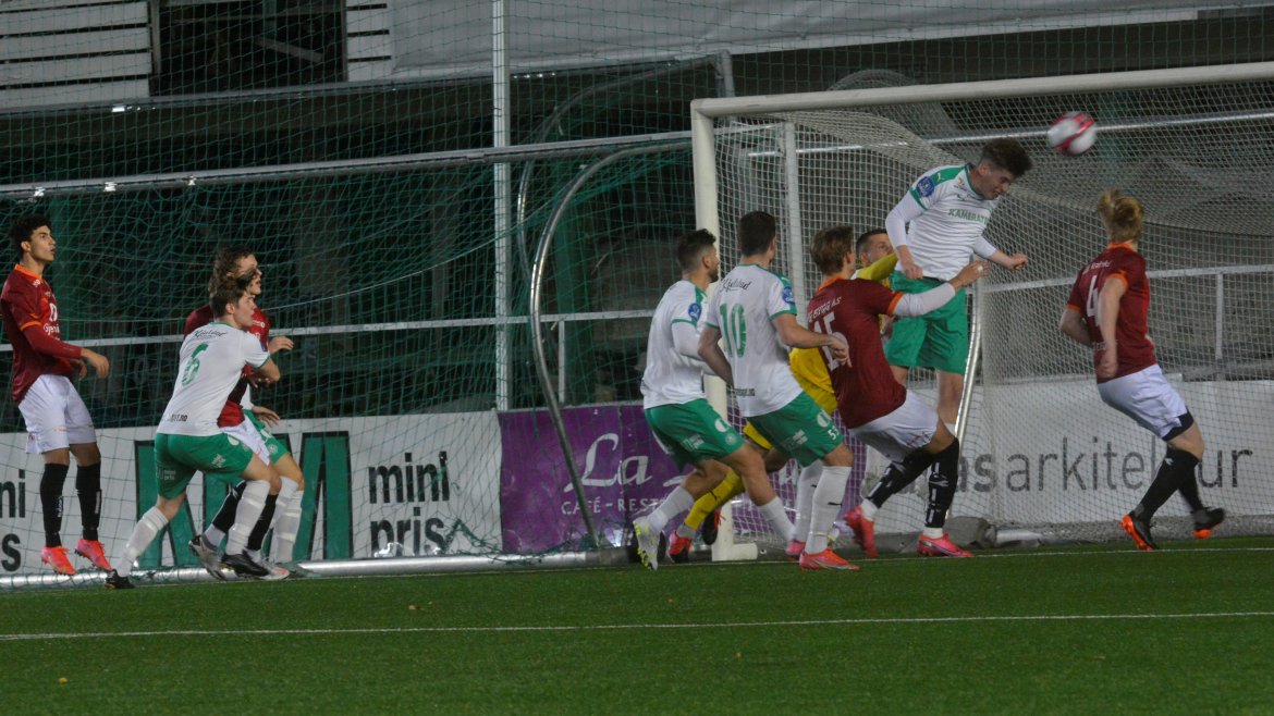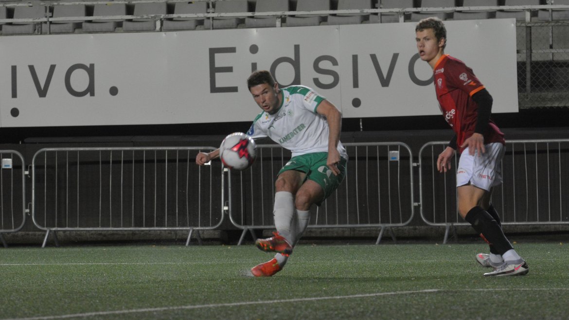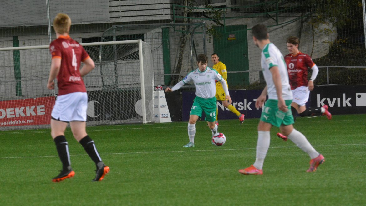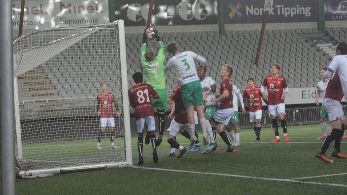 Først stiger Kristoffer Ring Voldhagen høyt til værs på et godt hjørnespark fra Davod Arzani. Han stanger den flott inn i lengste hjørnet.