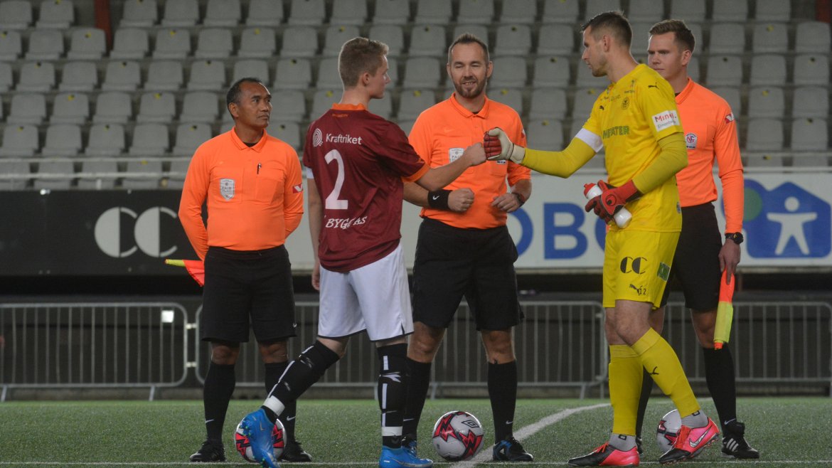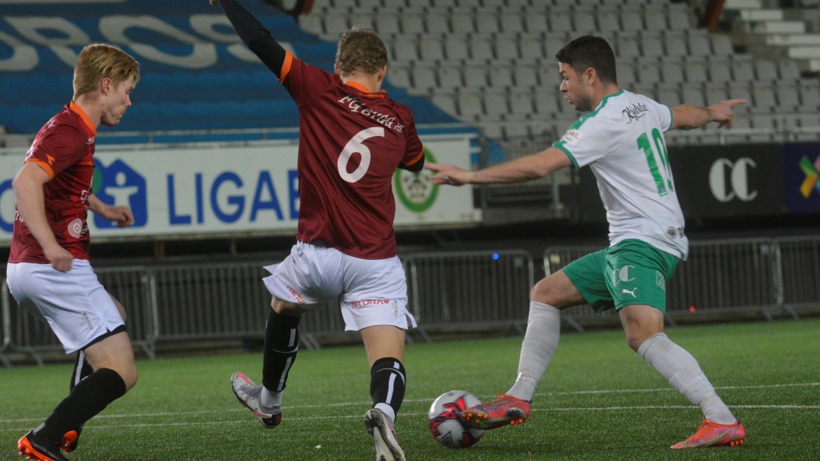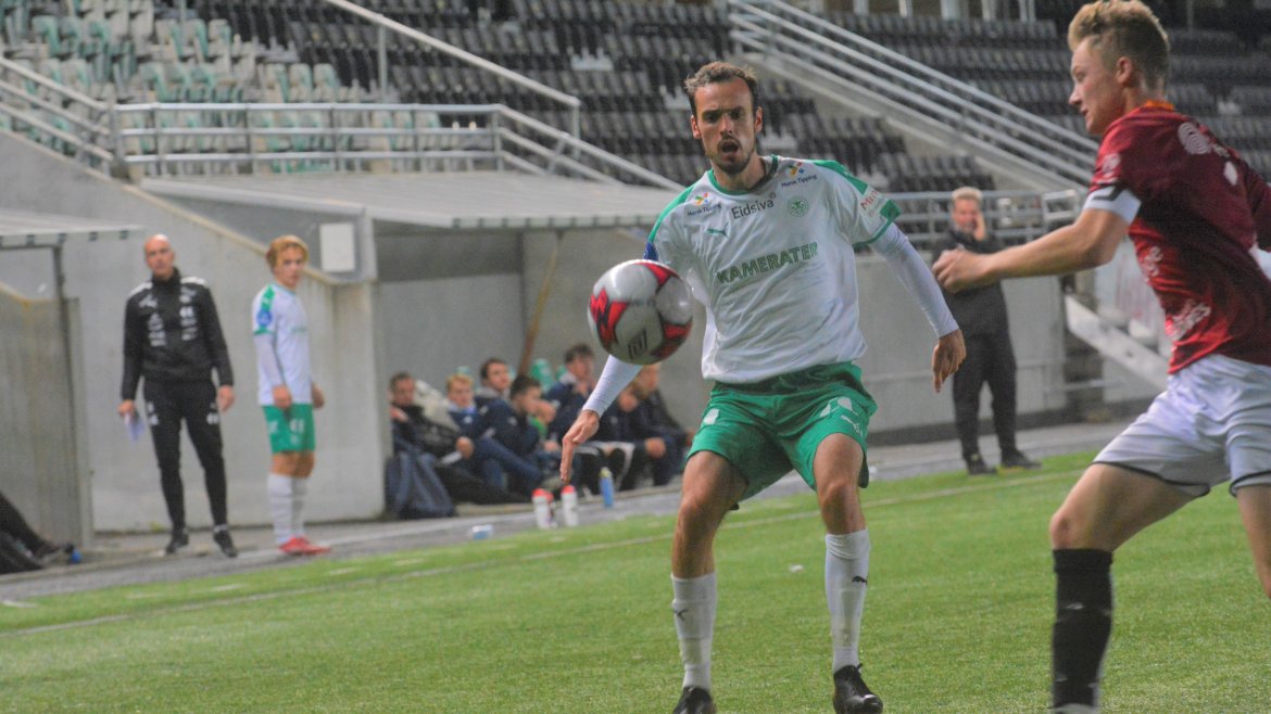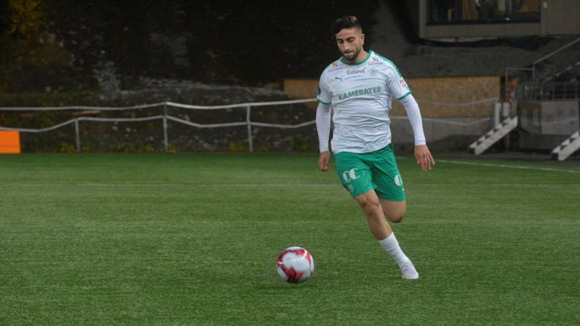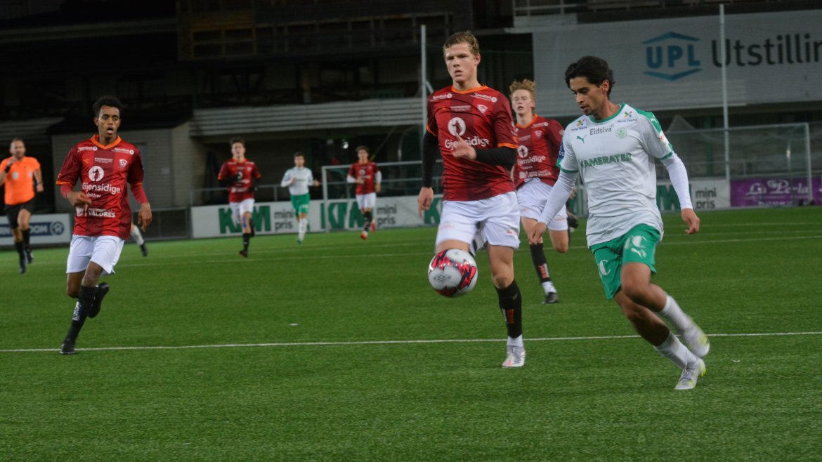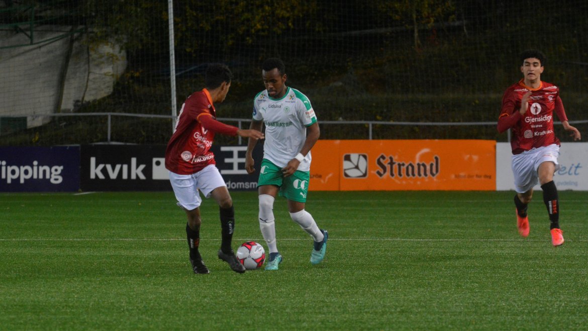 Først stiger Kristoffer Ring Voldhagen høyt til værs på et godt hjørnespark fra Davod Arzani. Han stanger den flott inn i lengste hjørnet.