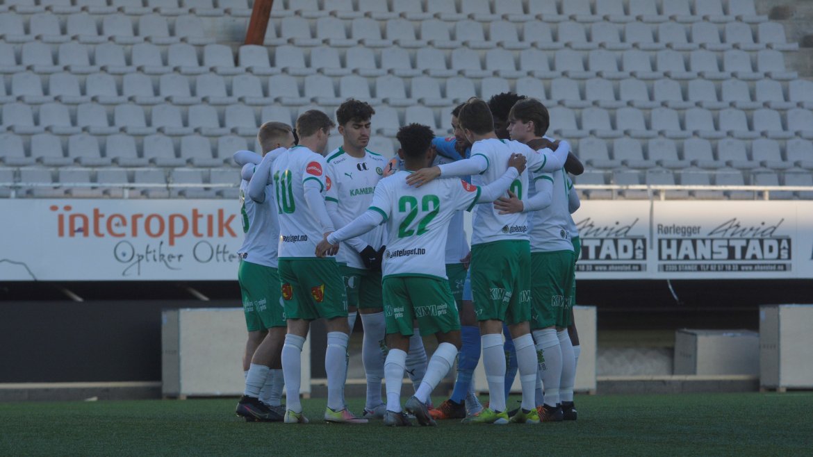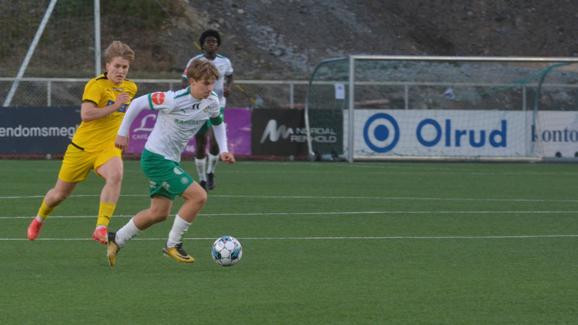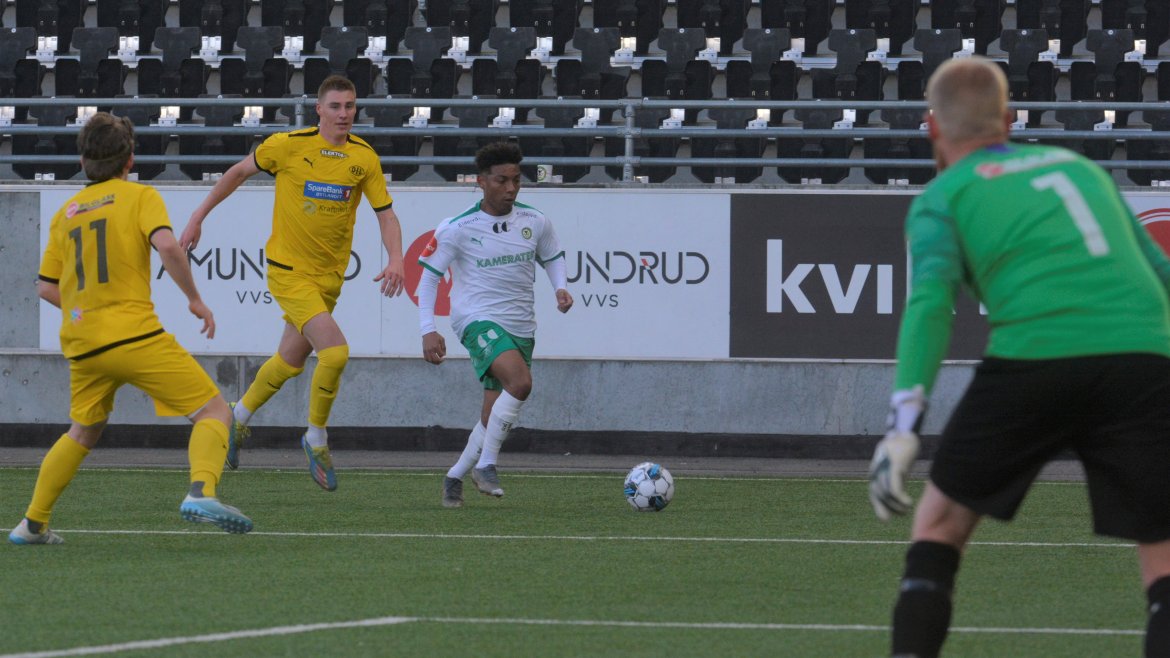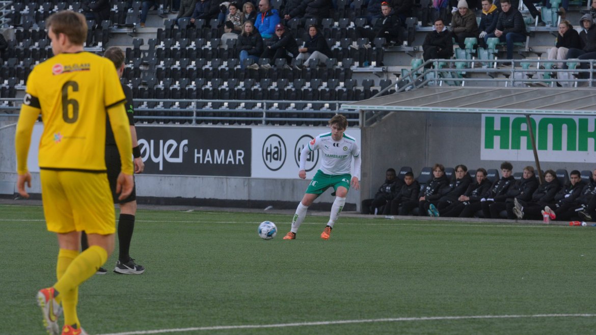 HamKam-rekruttene hadde god kontroll på oppgjøret i første omgang, og det var fullt fortjent da Fernan Faerron vinner duellen i feltet og header hjemmelaget i ledelsen etter et godt slått hjørnespark fra Kobe.