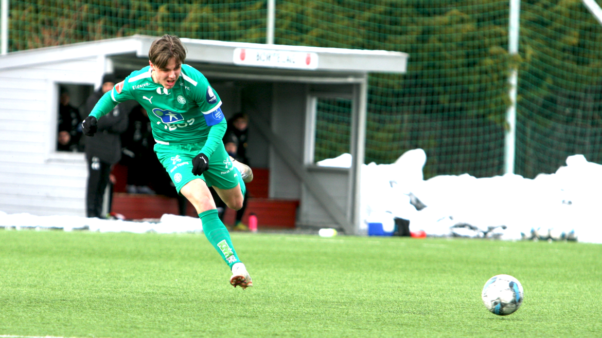 Kun minutter senere er Jonas Rasen på farten. Unggutten som tidligere i uken signerte sin første proffkotrakt runder sin oppasser og skrur ballen flott i mål fra 6 meter-