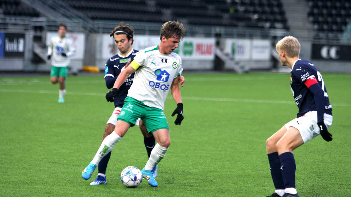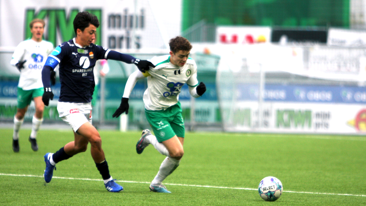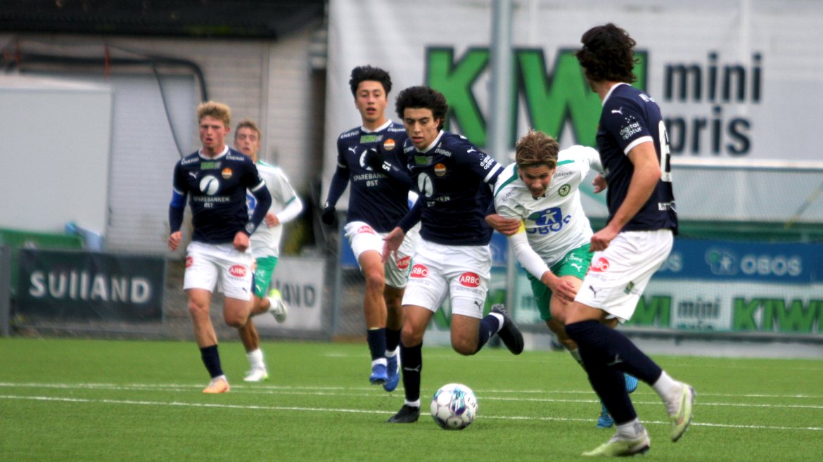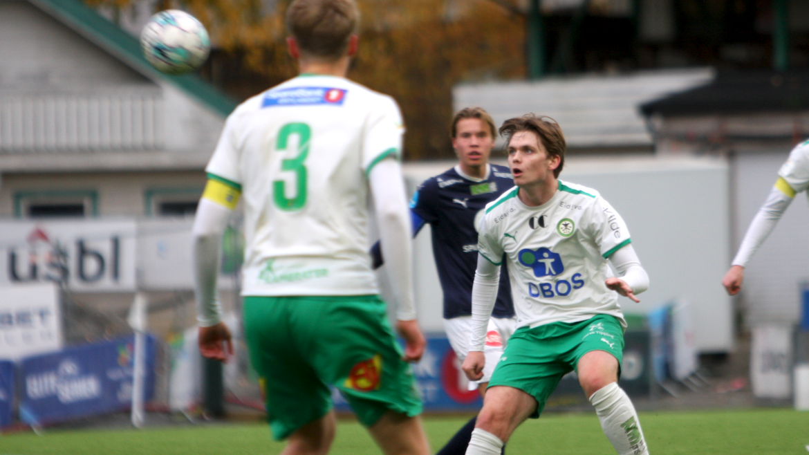 Kun sekunder senere jobber Jonas Rasen frem ballen på høyre side, triller ballen langs bakken mellom keeper og forsvarsleddet til Godset. Dessverre for hjemmelaget fikk en mørkeblå spiller tak i ballen før en Kamma-spiller.