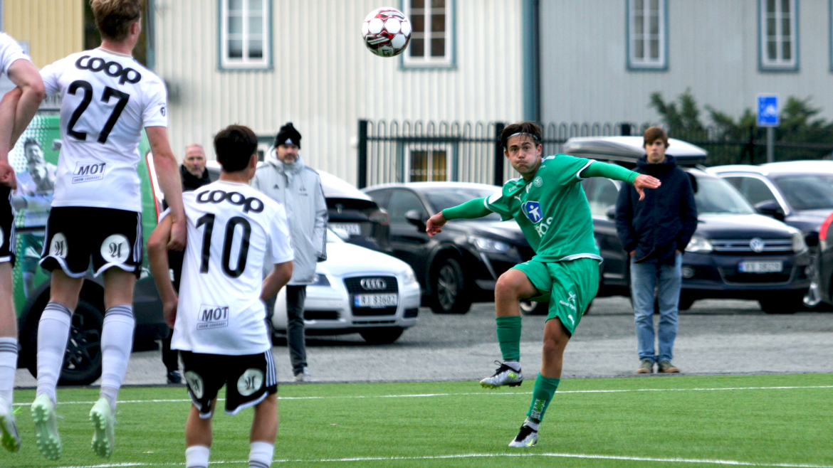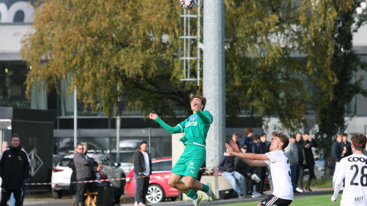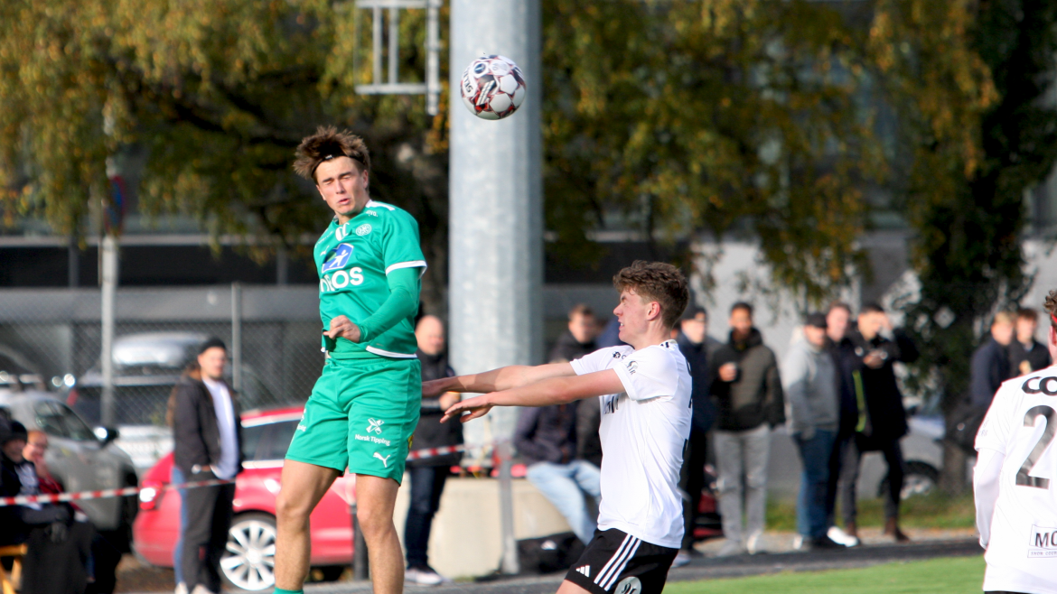 Så fikk hjemmelaget en dødball. Innlegget finner veien til Vemund Thue Gabrielsens hode, som igjen sikter inn nettmaskene på hodestøtet.