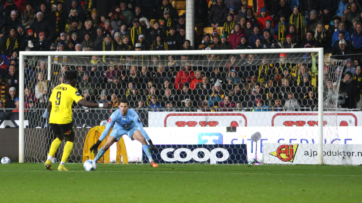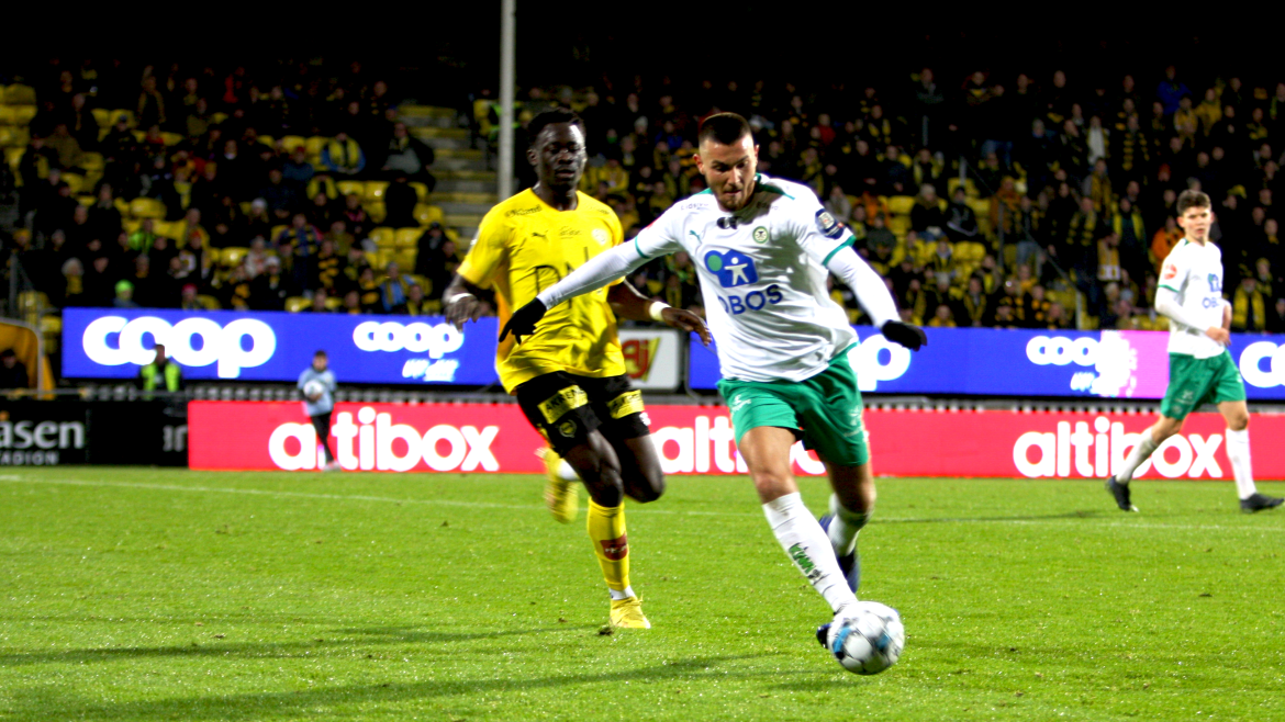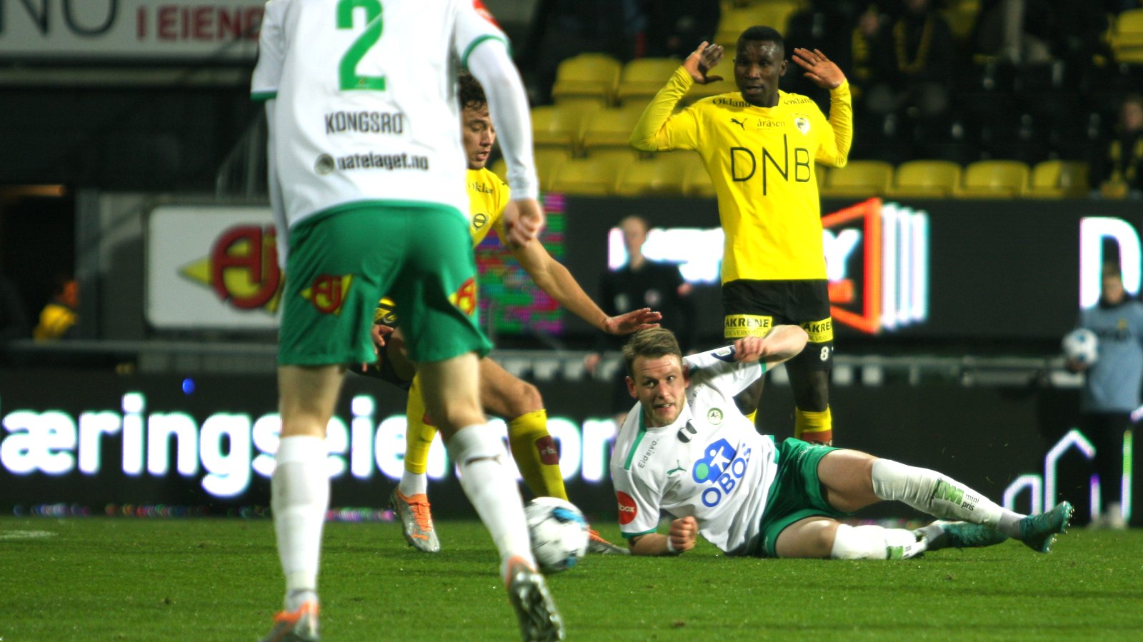 Akor Adams kommer plutselig alene med keeper etter en offensiv dødball fra bortelaget. Den hurtige angriperen satte ballen i nettet forbi Lars Jendal i Kamma-buret.