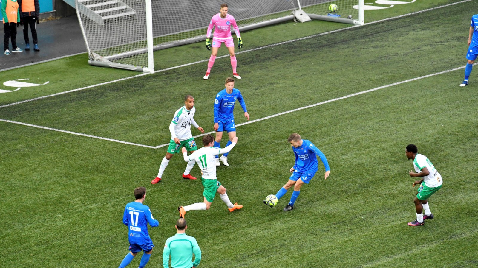 Noen få sekunder før dommeren blåser av kampen får Abu en sjanse på åpent mål og setter den sikkert bak, Johansson. Dermed gikk lagene til pause på stillingen 1-3 til bortelaget.