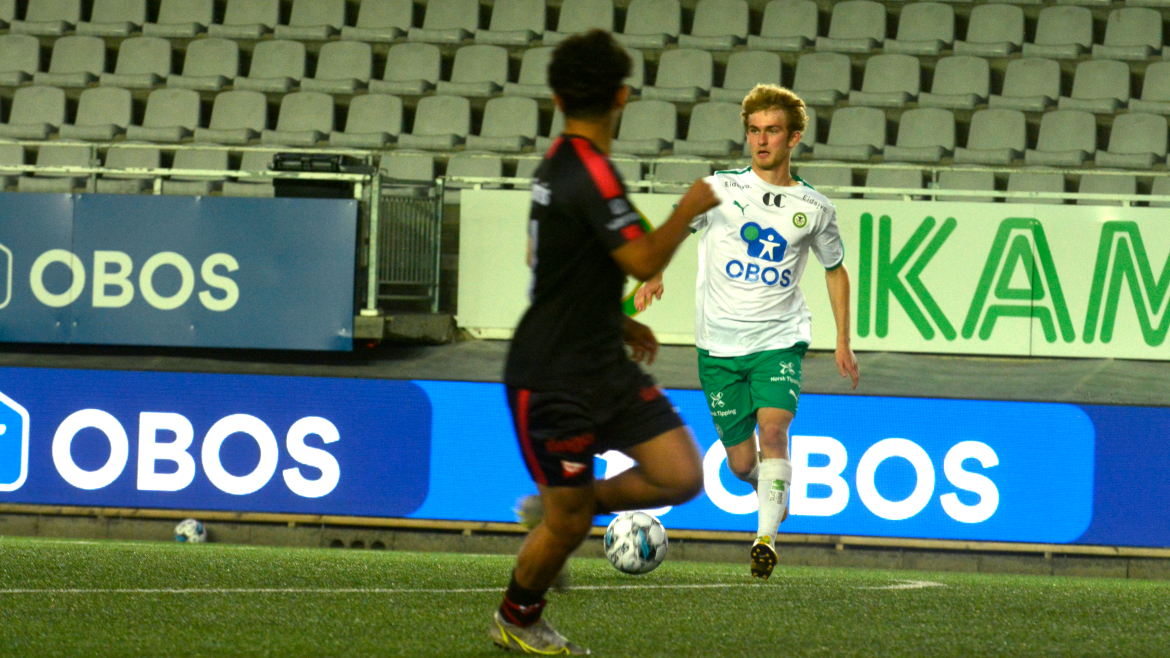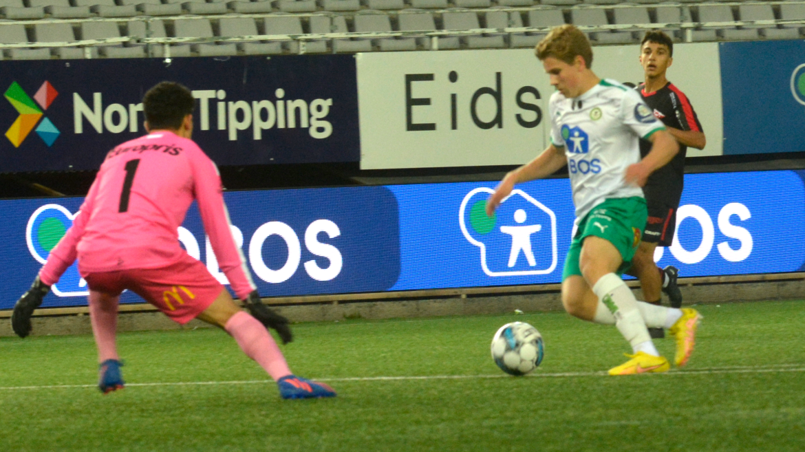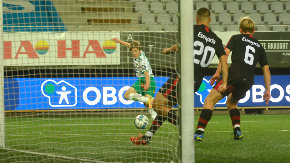 Det var lenge en rolig og sjansefattig affære på Briskeby. Ikke før halvtimen spilt ble det skapt en målsjanse. Den fikk hjemmelaget, og den var stor. Emil Øverby kommer alene med keeper etter et godt løp i bakrom. Den hurtige spissen runder keeper, men inne på strek kommer det to FFK-forsvarere som får klarert avslutningen.