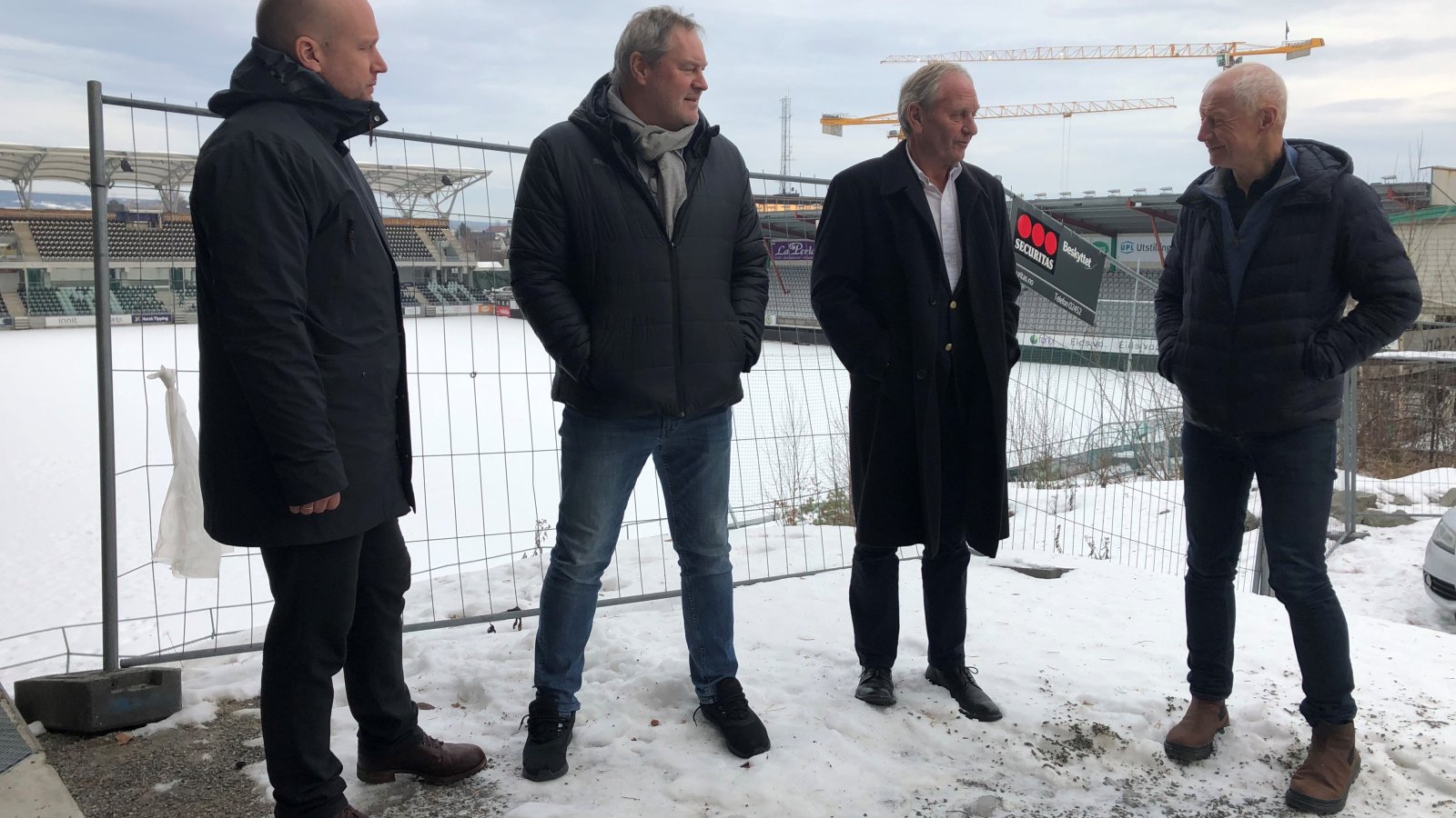 (Bildet (f.v): Kjetil Wold Henriksen (kommunalsjef), Bent Svele (daglig leder, HamKam), Frode Alhaug (utbygger), Einar Busterud (ordfører Hamar).