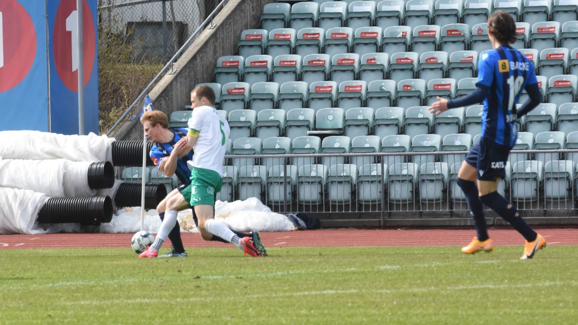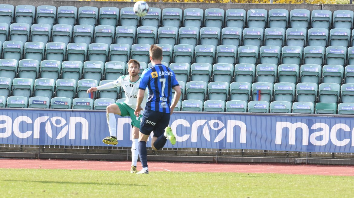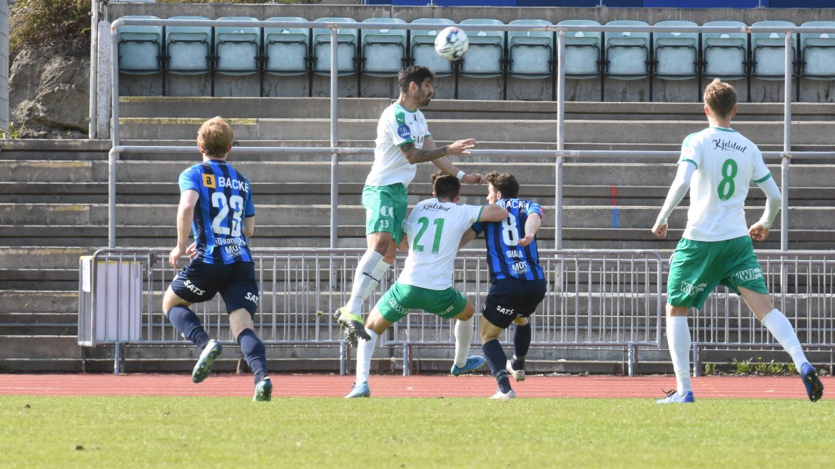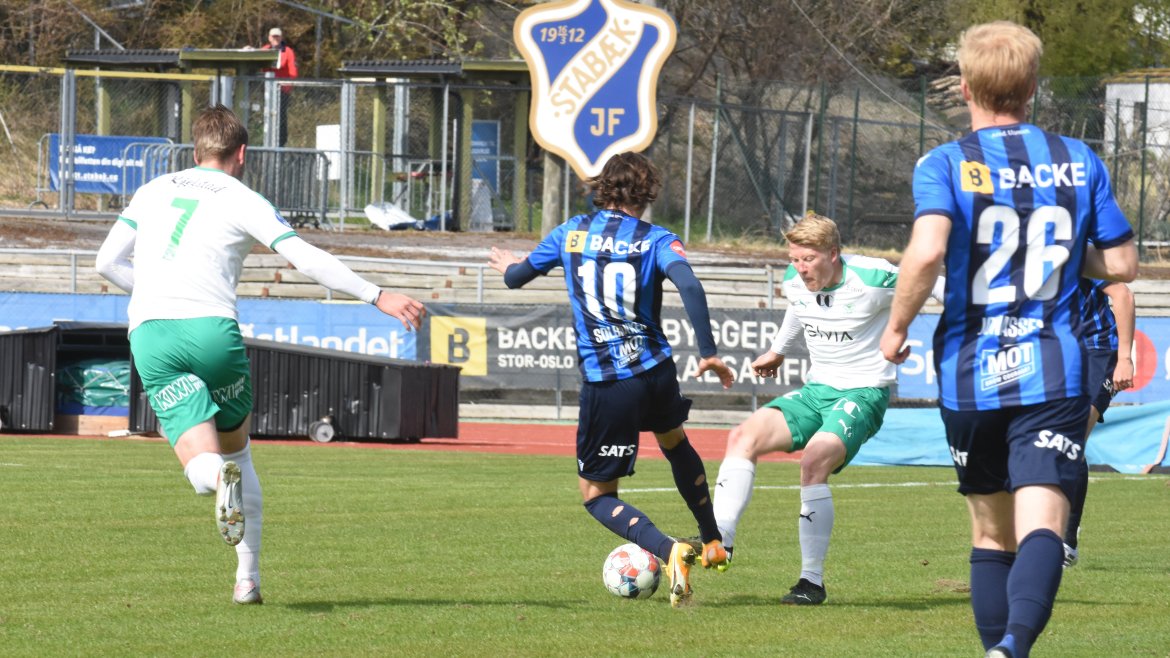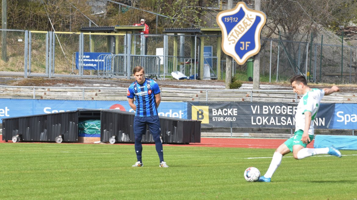 Gjestene styrer oppgjøret og får som fortjent ledermål etter tjuesyv minutter. Et strålende angrep starter med Hasan Kurucay som finner Kristian Lønstad Onsrud i midtbaneleddet, Gjøvik-gutten runder av et par i blått før han sender ballen ut til Aleksander Melgalvis som kommer i fint driv på høyresiden. Brumunddølen kommer seg fri og vipper ballen inn over Stabæks burvokter og finner Jonas Enkerud som har åpent mål. I nesten knestående stanger han inn ledelsen.