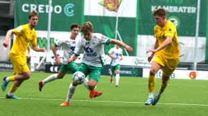 Her er Emil Øverby i aksjon mot Bodø/Glimt 2 i forrige seriekamp på Briskeby for HamKam-rekruttene. Lørdag ettermiddag scoret han hattrick og senket Innstranda alene: