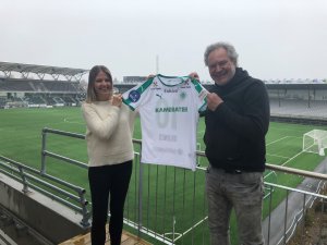 VIDEO: På bildet ser du markedssjef i Eidsiva, Vibeke Hoelseth og daglig leder i HamKam, Bent Svele som holder opp årets drakt. Hør hvorfor Eidsiva har flyttet seg fra magen til brystet: