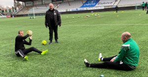 Det meste går fint på Gatelaget for tiden. Fredag fikk laget også egen keepertrener. På bildet ser vi at Jan Roger har satt i gang Christer (til venstre) og Kjell med fornuftige oppvarmingsøvelser på sin første økt som lagets nye keepertrener.