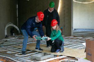 Her legger Finn Thorsen (80) og Emilie Heide Bredesen (11) ned boksen forteller om historien i forkant av byggingen. Bak skimter vi en stolt leder av hovedlaget, Per Gustavsen som bivåner det hele: