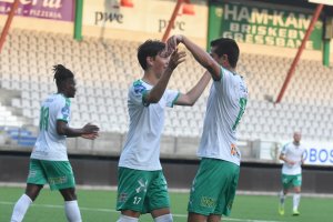 VIDEO/BILDEGALLERI: Det var gøy å være HamKam-spiller på Briskeby i kveld. Rekruttene ga seg ikke før det sto 7-0 på måltavla. Her jubler Andreas Strandlie og Davod Arzani over førstnevntes 2-0 scoring.