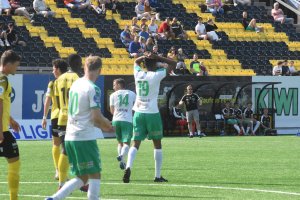 Her ser du Benjamin Gleditsch (liggende) feire sitt eneste HamKam-mål. Nå tar han en pause fra fotballen og flytter hjem til Oslo.